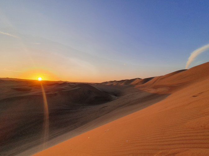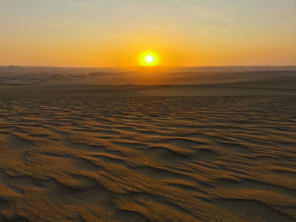 After a couple of hours to get something to eat and relax, it was time for the dune-buggy and sand-boarding trip. As I mentioned previously, this was amazing. The sand-boarding was fun but the trip in the dune-buggy was unbelievable. It was like being on a rollercoaster, but with better scenery. The driver was just throwing it about, powering up dunes before careening down the slopes. Our PeruHop guide had said we’d be going with the craziest and best driver. I thought he was just saying that but now, I can fully believe it. The experience concluded with a stop so that we could watch the sunset. Whilst it had been really nice the evening before, being further out in the dunes and being able to actually see the horizon made this time significantly more impressive. Despite only lasting for two hours, this was one of the most fun things we did during our time in Peru.