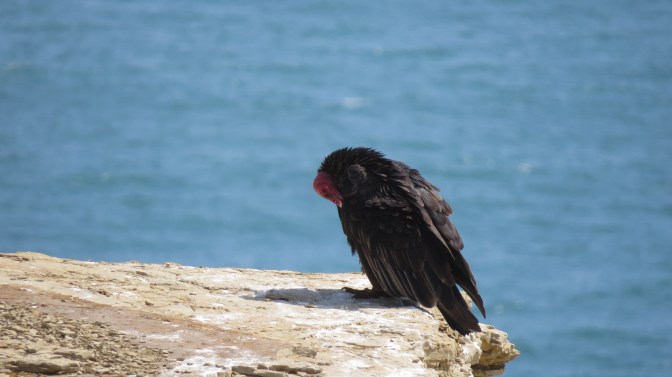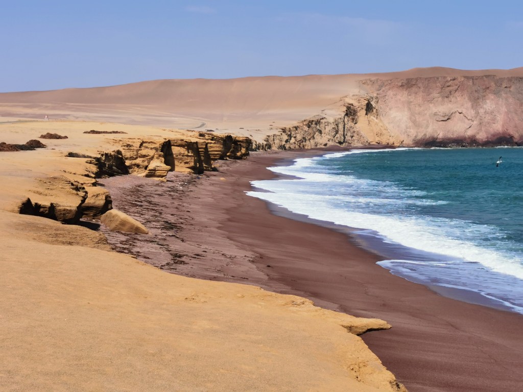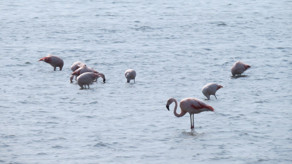 In the afternoon it was time for another ‘PeruHop free activity’. In this instance it was a ride to see the nature reserve that lies very close to the town of Paracas. We really enjoyed this trip. It looks as if the desert comes right to the ocean but the land only actually has a thin layer of sand. If you kick away this layer you come across a hard crust of salt. This area is effectively a salt plain, like the famous one in Bolivia, but the sand makes it look like the desert. What ever it is made from, the contrast of the land and ocean make for some spectacular views. We spent a while there just watching the ocean with only the vultures for company. We then headed a bit further into the reserve to where a red sand beach, caused by volcanic activity in the area, provided further contrast. On the way back we stopped right on the edge of the town when we spotted a flock of flamingoes relaxing in the shallows. We probably enjoyed this trip more than the one in the morning.