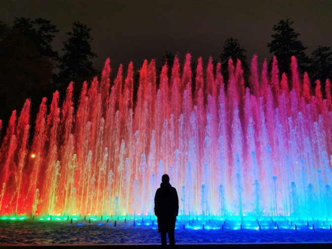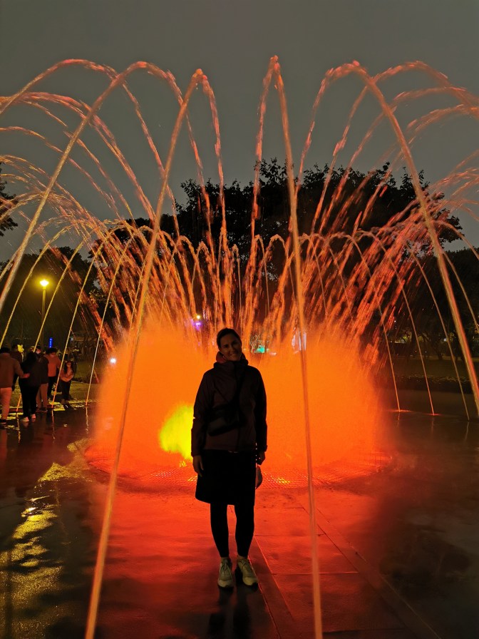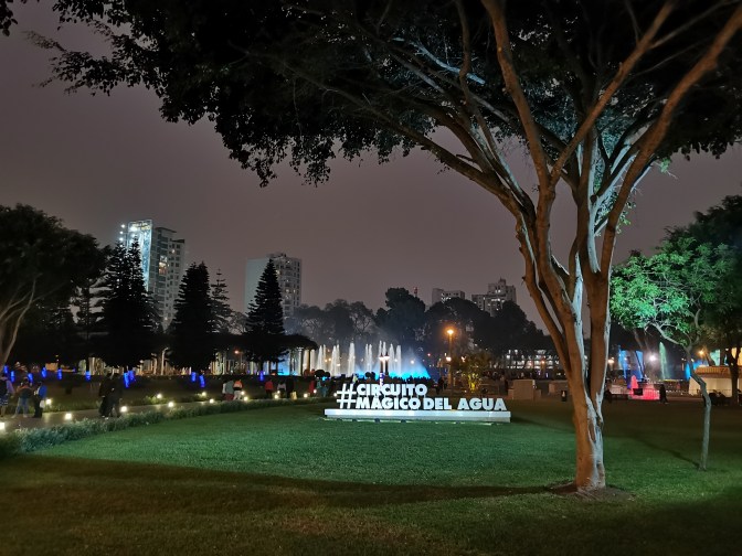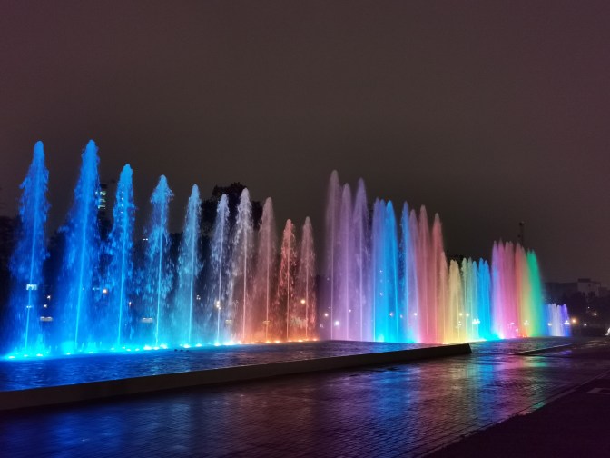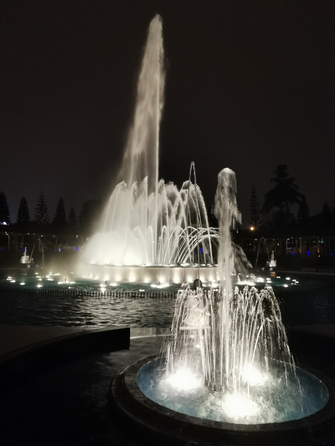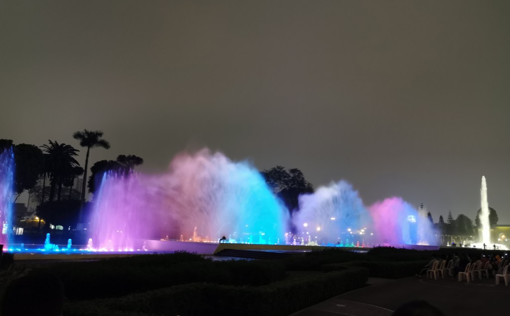 After finishing up in the historical centre of Lima, we got a taxi to the park housing the Circuito Magico del Agua – the magical fountain show. This had tacky attraction written all over it and yet we thoroughly enjoyed ourselves. The park has a series of different fountains that were lit up in different colours or moved as if dancing. And at the main fountain once an hour there was a show that involved the normal fountains moving to music but also used the streams of water as a background to project an animation onto. All in all we probably spent a bit over an hour at the park and it was a fun way to spend our last evening in Peru.