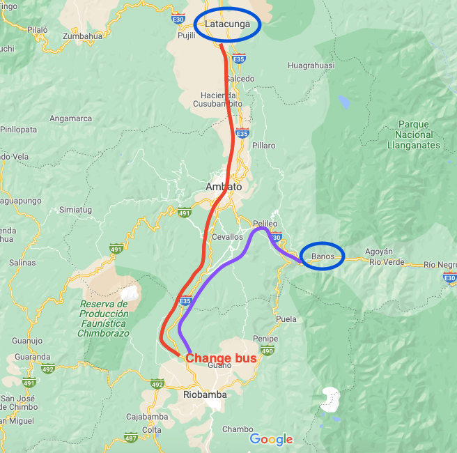 Het is geen probleem om van Latagunca naar Baños te gaan met lokaal vervoer. Je moet je alleen door een taxi op de juiste plek laten afzetten op de snelweg waar de bussen stoppen. De bussen gaan heel regelmatig. Wij konden gelijk op de bus die rechtstreeks naar Baños zou gaan voor $3 pp. E taxichauffeur hielp ons. Uiteindelijk moesten we toch overstappen in Ambato, maar die overstap duurde letterlijk 1 minuut. En ze hielpen ons met de rugzakken.