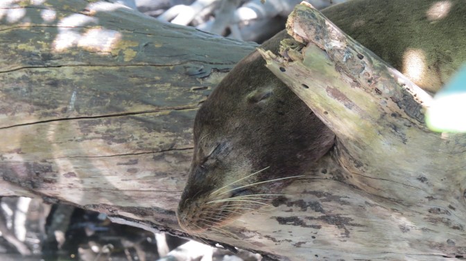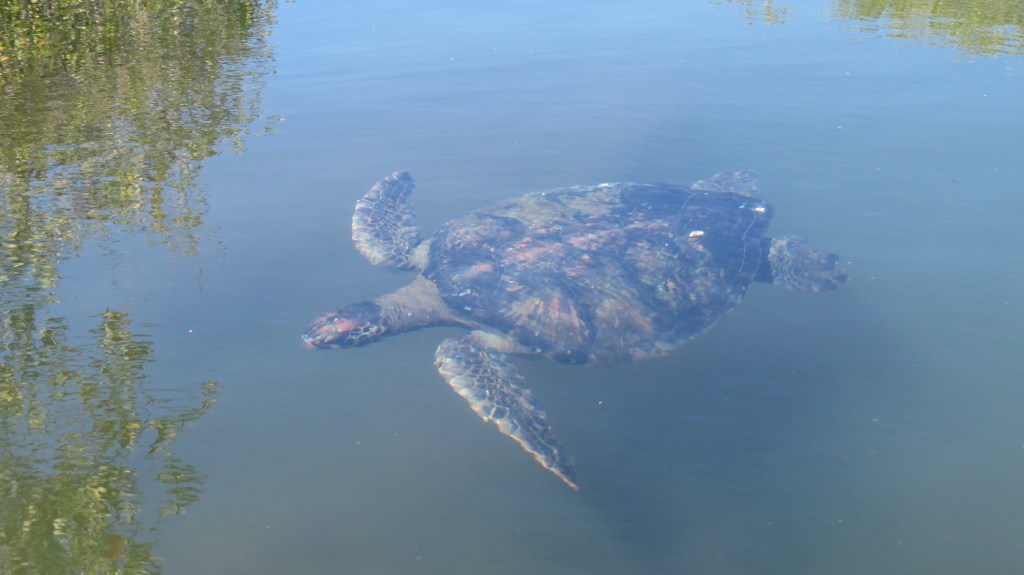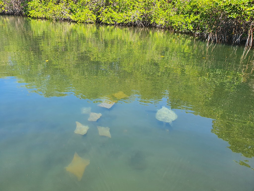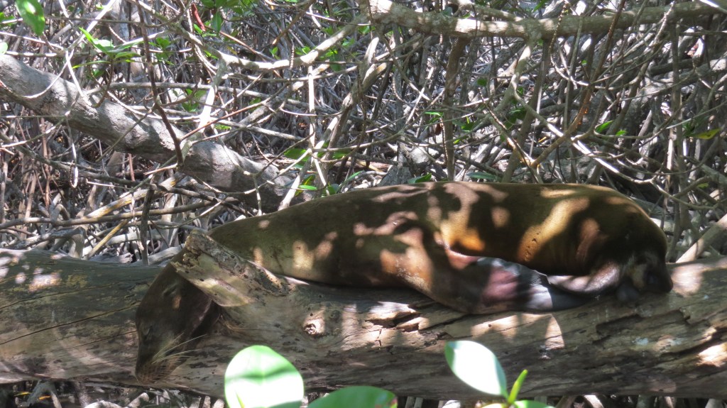 The mangroves, however, were even better. The trees themselves, along with the blue sky and water, provided a beautiful setting. So enraptured were we with the place we almost failed to spot when the first sea turtle glided serenely past our boat. Much like the sharks the day before, it was so surreal to have something like this so close. I thought we must have been lucky but as we progressed through the waterways we started spotting more and more. In all there must have been more than twenty at various points on our journey. The water was so crystal clear and the area was relatively shallow, so you were able to just sit in the boat and watch them going about their business. Another highlight was when a school of golden rays swam underneath our boat. The most surprising sight, however, was when we pulled up to see a sea lion asleep low down in a tree. Yes that’s right, I said in a tree. I had no idea they could even climb.