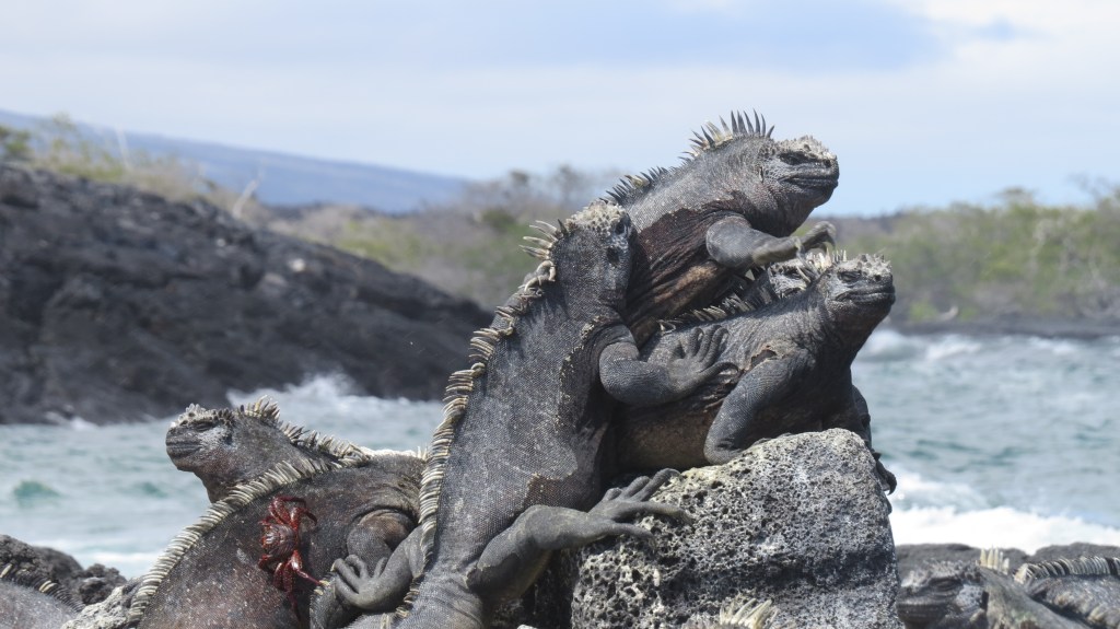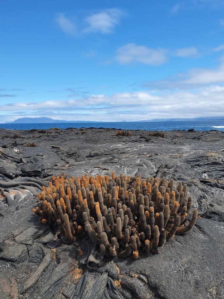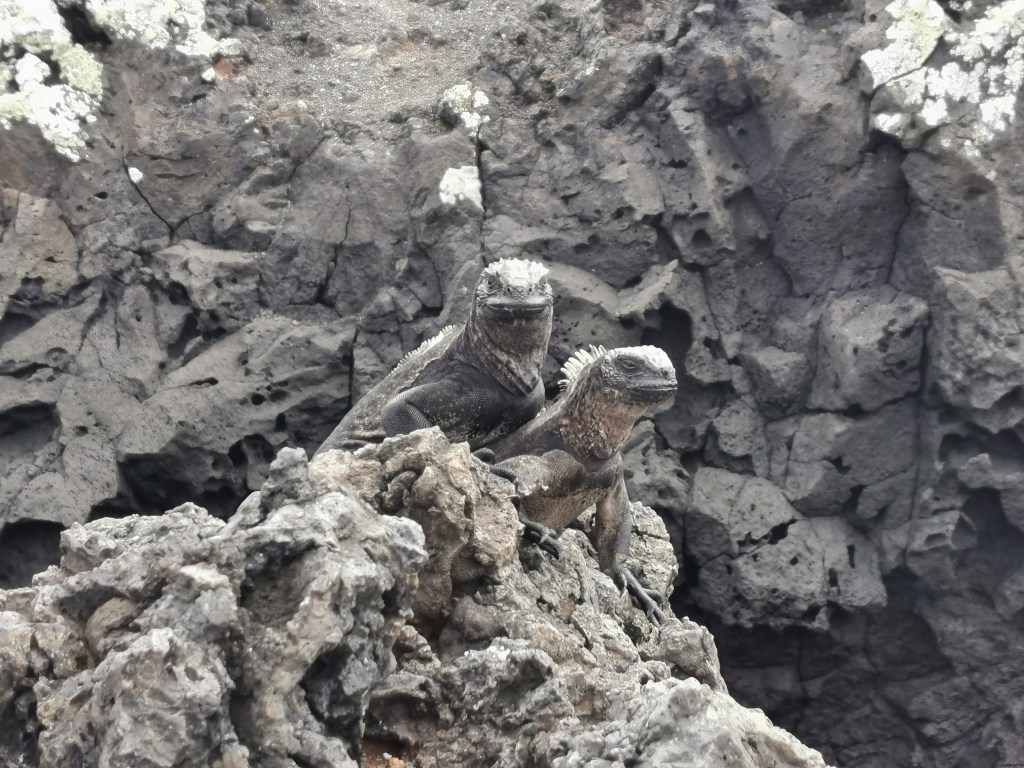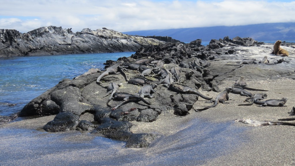 The first thing we did was to take the pangas to the docking point at Punta Espinosa so that we could go for a walk. The setting was beautiful, the flat land going on for ages until suddenly rising up to form the volcano. The peak was unfortunately shrouded in clouds but that did little to detract from the amazing scenery. We made our way over the lava fields and passed funny clumps of lava cacti before getting back towards the shore. At this point the rocks seemed to be shifting but the reality was that they were just covered in dozens upon dozens of marine iguanas. There were just so many of them all lying over each other, congregating in massive groups. We had thought that marine iguanas were everywhere on the islands previously, but this just took it to a whole other level. If they weren’t just lazing in the sunshine they were walking to and from the ocean, where you could see the odd one swimming in its rhythmical, rather-odd fashion. Instead of using just its tale or legs, the iguana moves its whole body to be able to propel itself through the water. Whilst the close proximity was useful for maintaining heat, it led to multiple fights as the iguanas squared up to each other, aggressively shaking their heads and occasionally crashing into the other. Although none of the fights lasted for long – it seemed to take just too much energy!