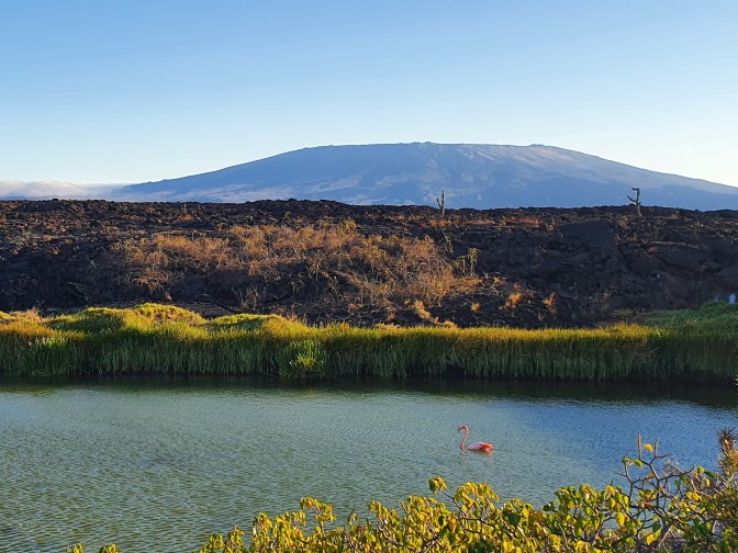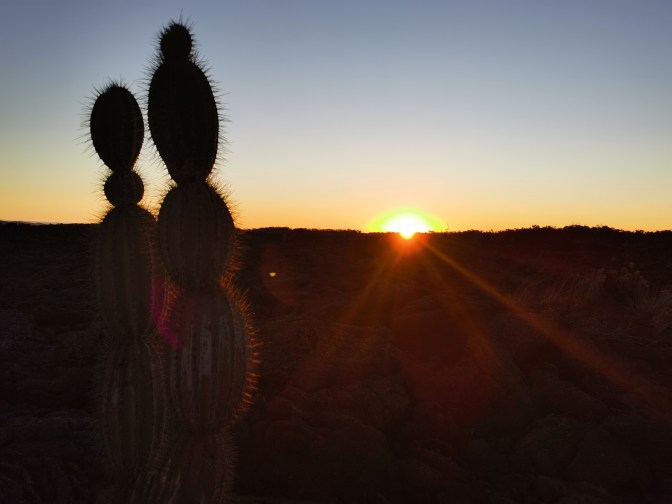 After having a hot shower to warm up (this is one of the best bits about doing a cruise rather than island hopping and doing day trips) we set off in the pangas to get to the lava fields at Punta Moreno. This is an other-worldly environment of black sharp rocks that, at first sight, seems to be devoid of life. But as we made our way along the loop we found that this was not so. Firstly there were cacti dotted around and then further on, little pools had started to form, adding splashes of blue and green to the landscape. Along with little lava lizards that scurried along the ground, there were a couple of flamingoes frequenting the pools. All of this was under the gaze of the massive conical volcano. As we returned towards our waiting pangas, the sun was just setting over the lava fields so that we were greeted with beautiful skies as we returned to the boat.