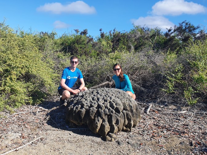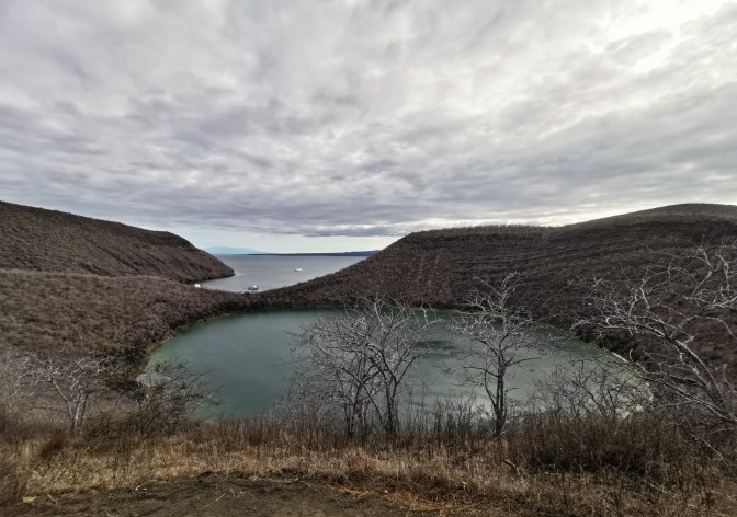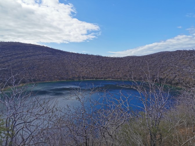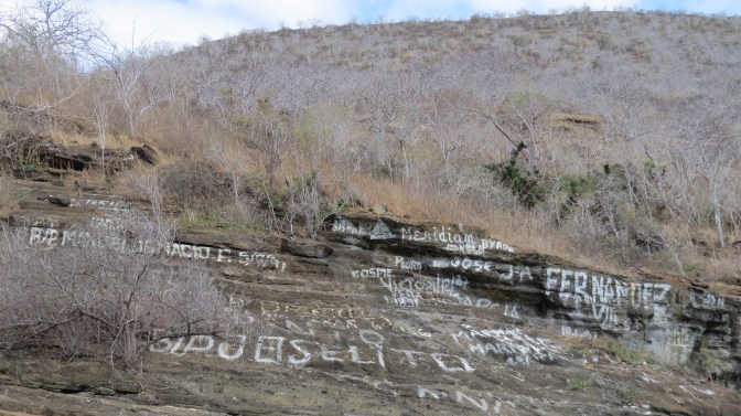 Our next activity was another walk. Where we docked the cliffs were full of scrawled names and dates of different ships that had been to this area, some of which went back decades. From there, we walked up the hill through masses of bare trees. We were worried they might be dead but it turns out that these trees lose their leaves during the dry season. Given the proximity to the equator, the Galapagos do not really have seasons such as summer and winter but they do have wet and dry. These Palo Santo trees were traditionally cut down and shipped to the mainland to burn as incense in churches and even in their unburnt state you could recognise the smell as you walked through. We were also told that the sap was good for your skin and healing wounds, so we each took a bit but what hadn’t been mentioned was that it was exceptionally sticky and wouldn’t come off. We tried soap, water and also alcohol but none of it worked. It was only when we got back to the boat that one of the staff suggested using milk and thankfully this worked a treat.