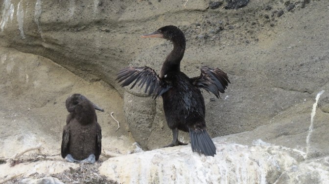 As we made our way into the cove to go snorkelling we spotted a pod of dolphins in the distance back the way we had just come, so we sped out to try and meet them but they were heading in the opposite direction at speed so we had no chance. So on the second time of asking we made our way into the cove and went to the water. It was worth the wait. As well as a multitude of fish that seemed to hug the edge of the cliffs, there were a few penguins that were fishing and repeatedly swam past us, only a few metres away. Then, just before we got out, a couple of sea lions came to play, swimming in amongst the different members of the group not unlike puppies come to see what was happening. As amazing as this snorkelling spot had been, it was really cold so I was happy to get back on the boat.