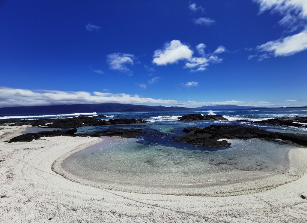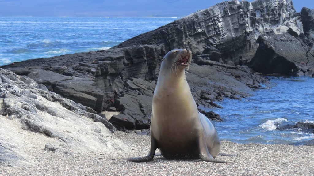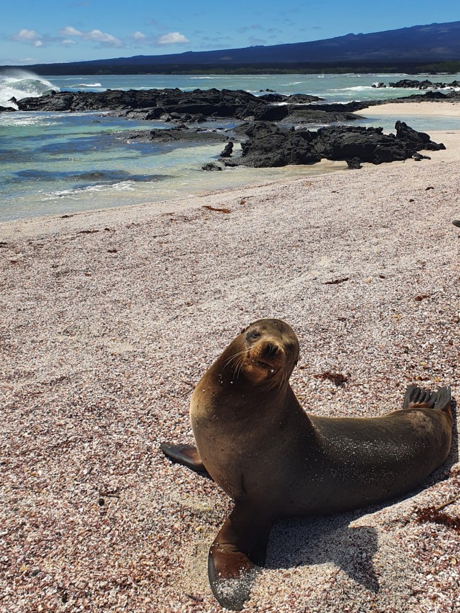 The driver of the panga had made it all the way back to the port before he remembered that we had a stop to make first, so he turned around and headed to the Islotes Las Tintoreras, a tiny group of islands a bit off the coast. We walked through the black volcanic rocks, marvelling at the marine iguanas posing around every corner, until we got to a little bay. This sheltered area was home to at least twenty white tip reef sharks. Apparently, unlike most types of sharks, this species does not need to be moving as they sleep, so they were just lay resting on the bottom of the shallow, protected cove. It was surreal to see sharks so close, despite being told that these sharks are not dangerous to humans. Whilst we were still marvelling at the sight, a sea lion appeared in the little bay and started blowing bubbles and chasing a couple of them around. We were told that this was just for fun – the sharks aren’t a danger to sea lions either. It was a great start to the day.