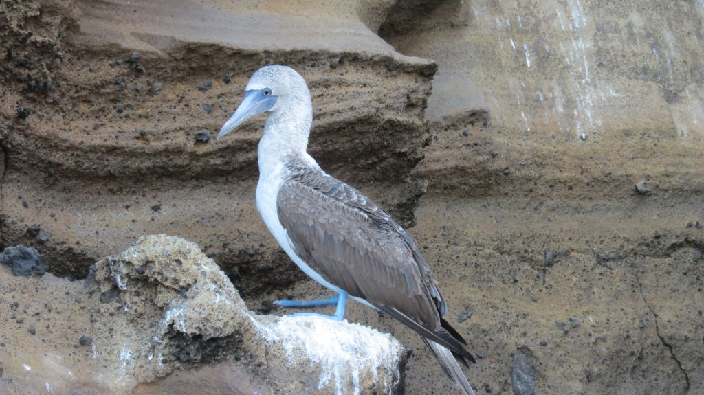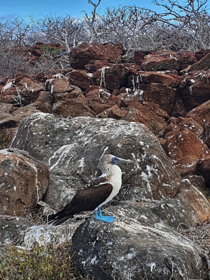 As we had some lunch, the boat carried on north towards Vicente Rock. This is a picturesque stretch of cliffs at the edge of a cove, which we had a closer look at by heading out on the pangas. We got our first proper look at a Blue-footed Booby, one of the iconic species of the Galapagos. With its bright blue feet and beady eyes, it quickly became one of our favourite animals.