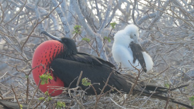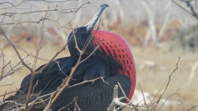 After taking the pangas to shore, we made a loop through the small bare trees. Well, bare in terms of leaves but certainly not in terms of birds. There were dozens if not hundreds of them. And it wasn’t long before we saw our first male puff up the bright red sack of it’s throat and start beating its wings. Others simply held out their wings as if to say, ‘look at me, aren’t I magnificent’. There were also plenty of females and the chicks were still quite fluffy despite being pretty big at this stage.