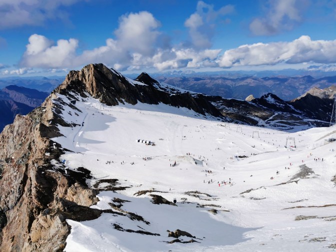 We had never skied so early in the season before, but the advantage of having a resort on a glacier is that there is always likely to be some slopes open during the season. And even though the lower slopes were not ready yet, there was still enough at the top to have a couple of very enjoyable days of skiing. I say days, but by the afternoons the snow, even at the top, was pretty slushy, so we got there as early as possible, had a prolonged morning session to get the best of the conditions and then didn’t do much after a late lunch. But given that we weren’t sure that we’d be able to ski at all, the time we had with good conditions was much more than we had expected. We also took advantage of the easy afternoons to go along the tunnel to access the other viewing platform. The first time, we went in our ski boots as we didn’t realise just how long the tunnel was and also that it has a quite an incline, so I’d definitely advise changing into normal shoes if you carry them in your bag. The views of the mountains were probably even better from this new angle, so it is definitely worth doing.