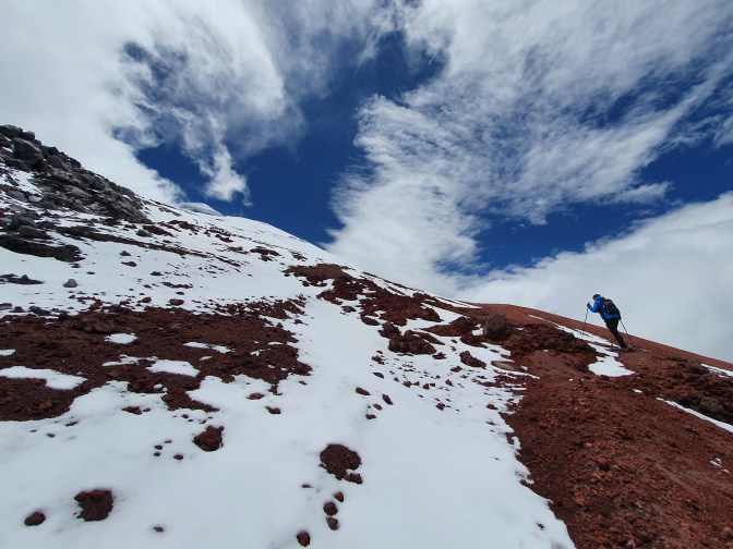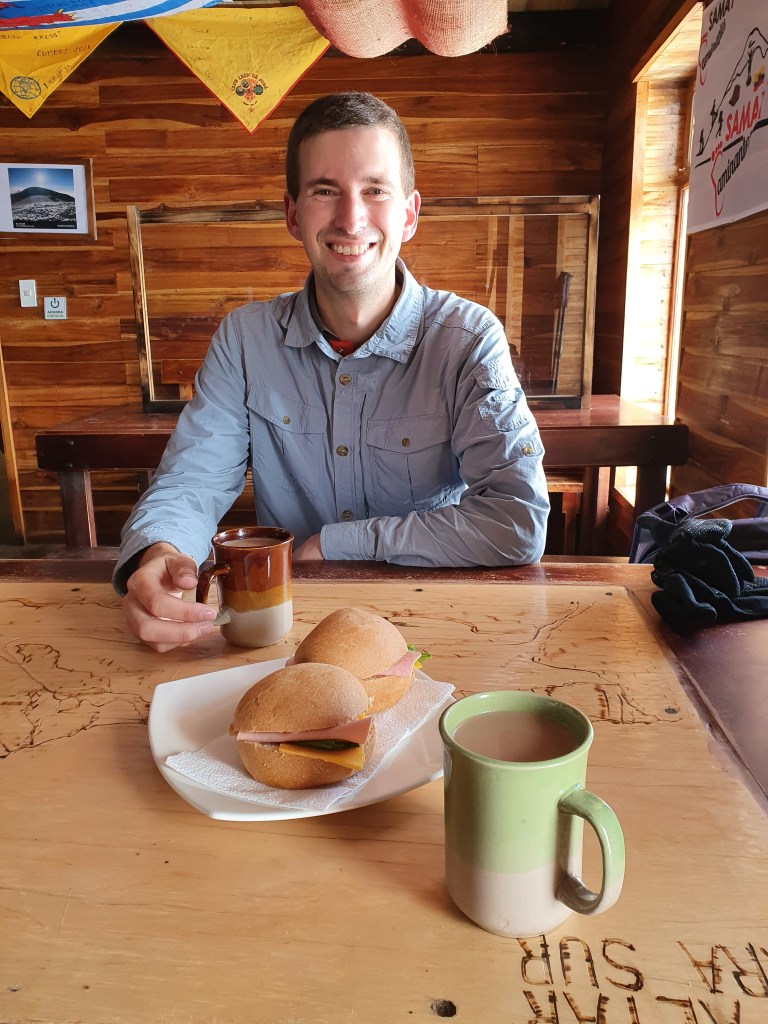 Over an hour later, we made it to the refugio. This mountain hut is used as a base for those who aim to summit the volcano. To do this you need proper equipment (crampons etc.) and a guide. However, we were happy to use it as a break from the wind and for its simple sandwiches and tasty hot chocolate.
