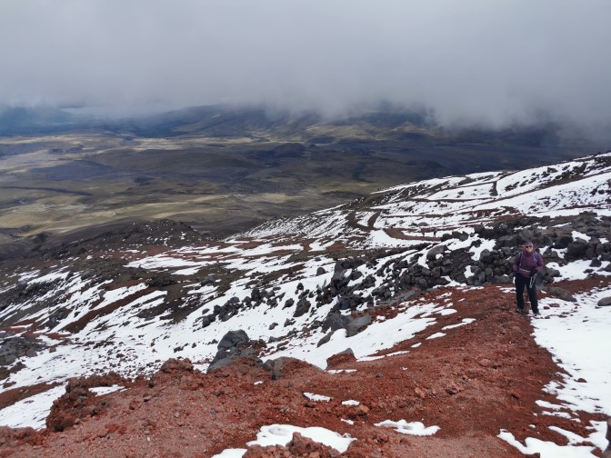 After we had finished we had a choice of either returning to the car park or trying to get a bit higher and see a rare example of a glacier in the equatorial zone. Despite the weather we obviously opted for the second option. The route is not signposted and is definitely not easy to follow so we were pretty reliant on Maps.me for navigation. The path led us over an area where the white snow contrasted magnificently with the deep red volcanic rock and made for some stunning photos. After a while, however, the snow started getting thicker and the clouds were becoming more and more dense the higher we got. Despite wearing hiking boots, we were beginning to slip and slide so made the decision to just head back. We didn’t quite make it to the glacier but wouldn’t have been able to see anything anyway!