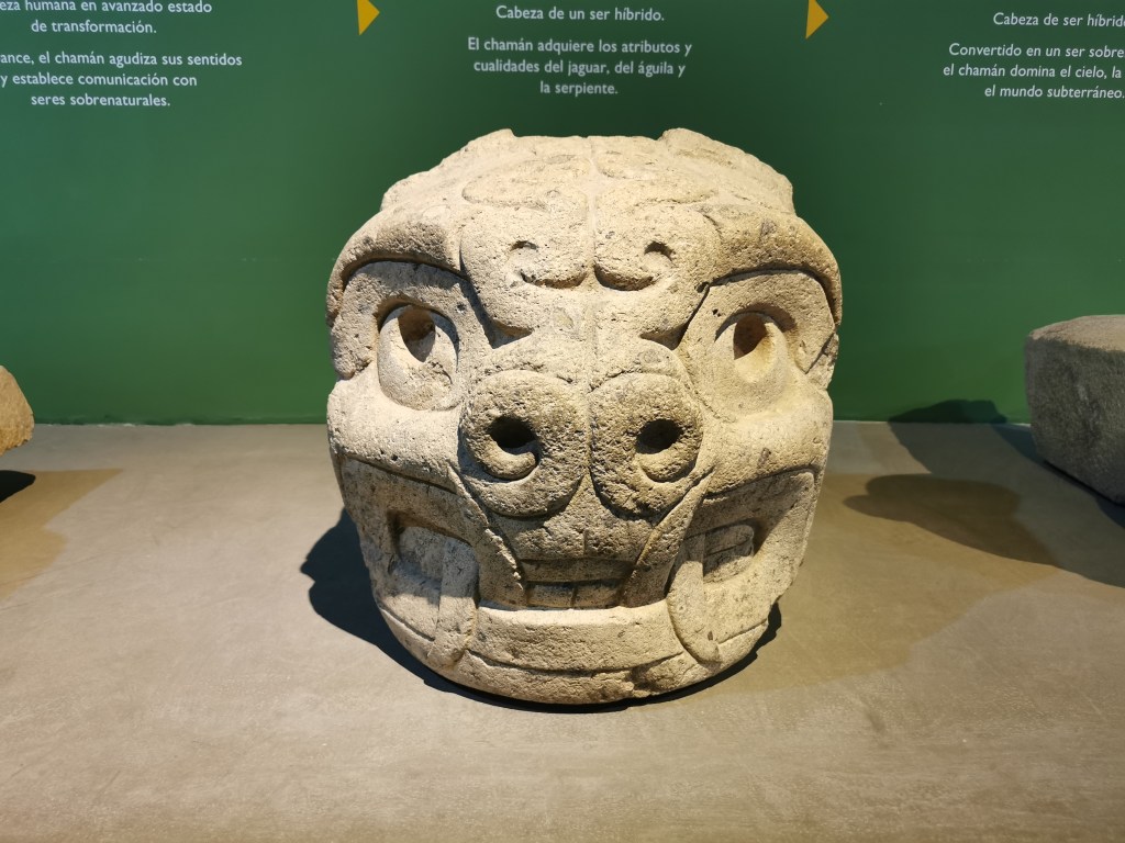 After walking for a bit we came to the main complex. This consists of a main square with buildings flanking three sides. The square was built into the ground and would have initially been filled with water from channels dug under the buildings connecting to nearby rivers. It is not known for sure what the purpose of the complex was, but it is speculated that the sounds of the water in the channels would help the persons involved in the ayahuasca-style ceremonies to reach an altered state. We had not researched this place, as we had not initially intended to come, so the scale of the complex was surprisingly impressive. After seeing the buildings from the outside we were able to enter a couple of them via their tunnel system. We would have been able to see more before COVID. We then finished by visiting the one statue left in the complex.