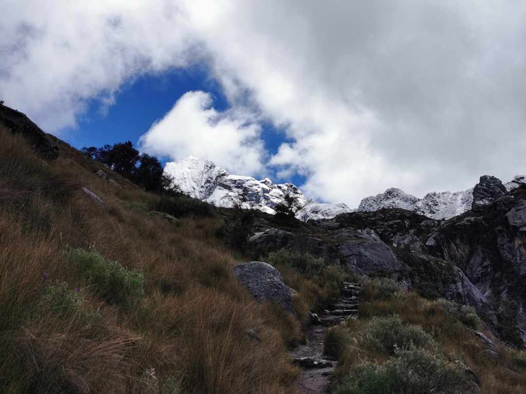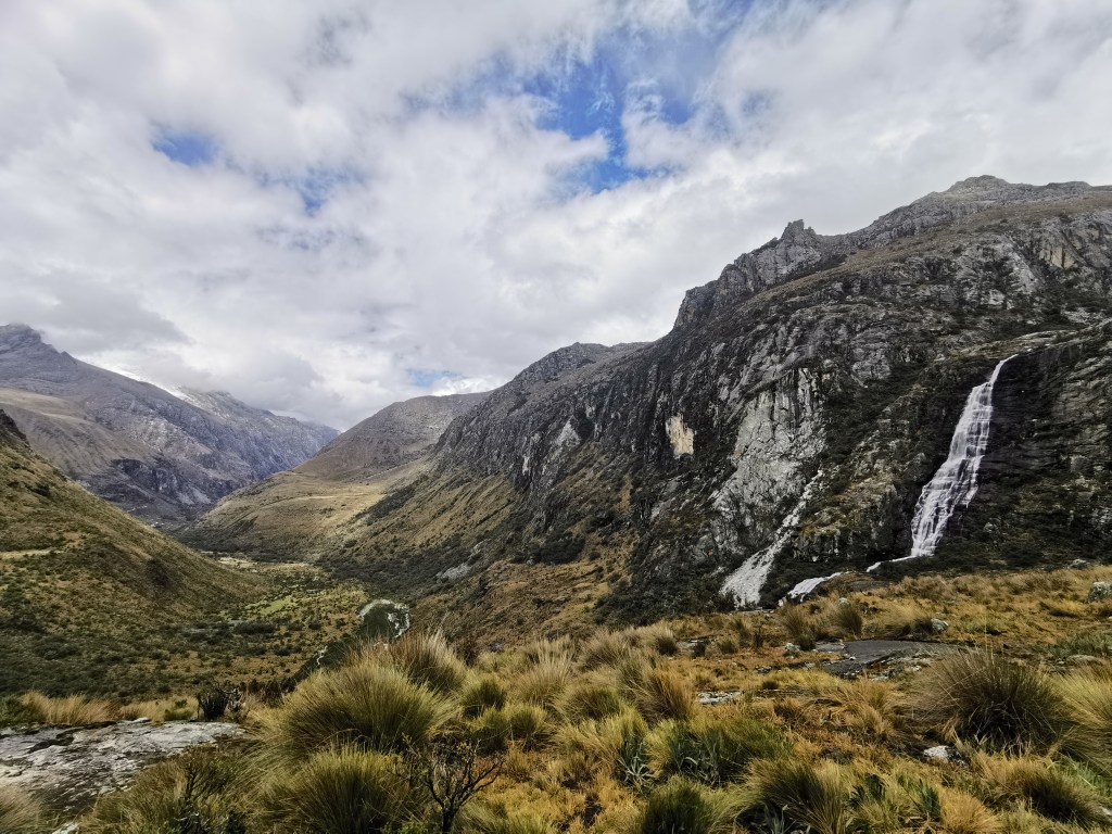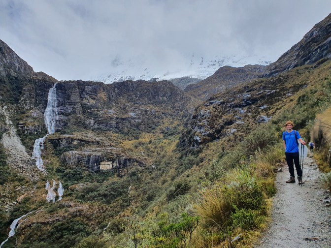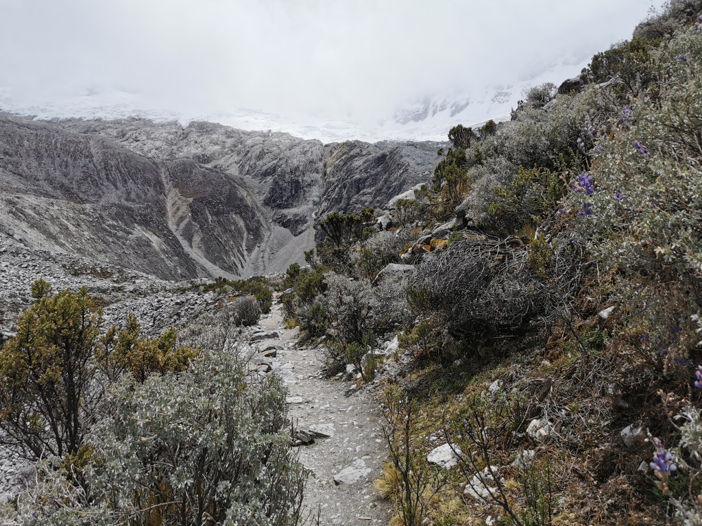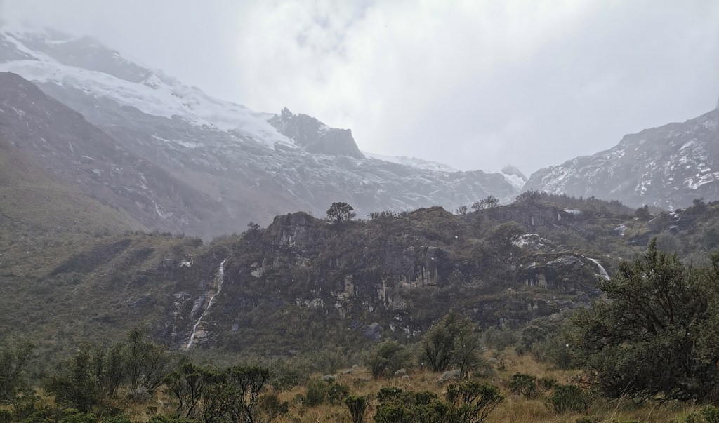 After a while the gradient of the path starts going up, gradually at first but getting more and more pronounced. The scenery starts getting better, however, with several waterfalls lining the slopes on either side. You then get to the first of two steep climbs on the route. Whilst neither of these parts are as technical as what we experienced on the Laguna Churup hike, they are steep and at this altitude it takes some effort to get up them! The first steep section leads to a kind of plateau up in the mountains where a small lake and a flat walk allow some respite for your tired legs. You should also be able to see the snow-covered peaks that you are aiming for but for us they were still covered in cloud.