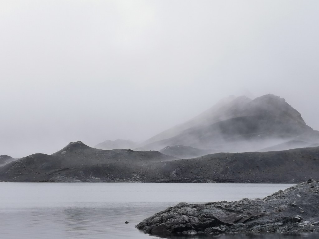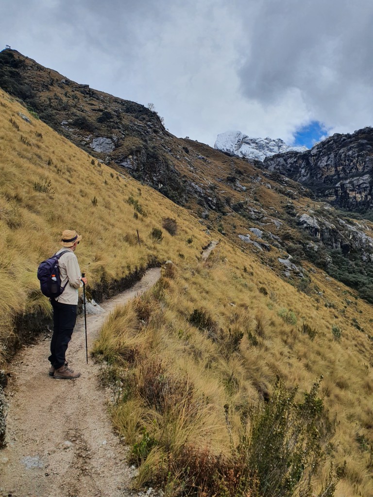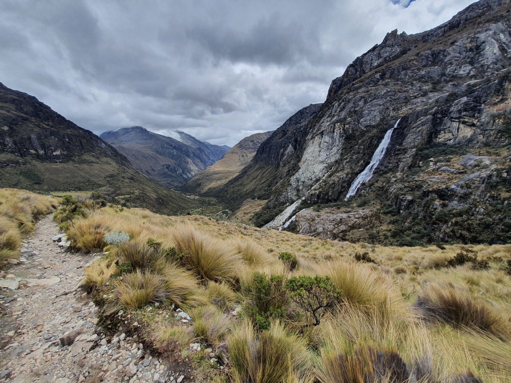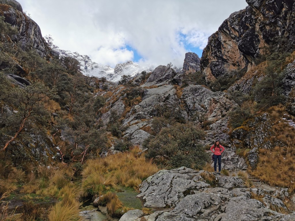 After a while the gradient of the path starts going up, gradually at first but getting more and more pronounced. The scenery starts getting better, however, with several waterfalls lining the slopes on either side. You then get to the first of two steep climbs on the route. Whilst neither of these parts are as technical as what we experienced on the Laguna Churup hike, they are steep and at this altitude it takes some effort to get up them! The first steep section leads to a kind of plateau up in the mountains where a small lake and a flat walk allow some respite for your tired legs. You should also be able to see the snow-covered peaks that you are aiming for but for us they were still covered in cloud.