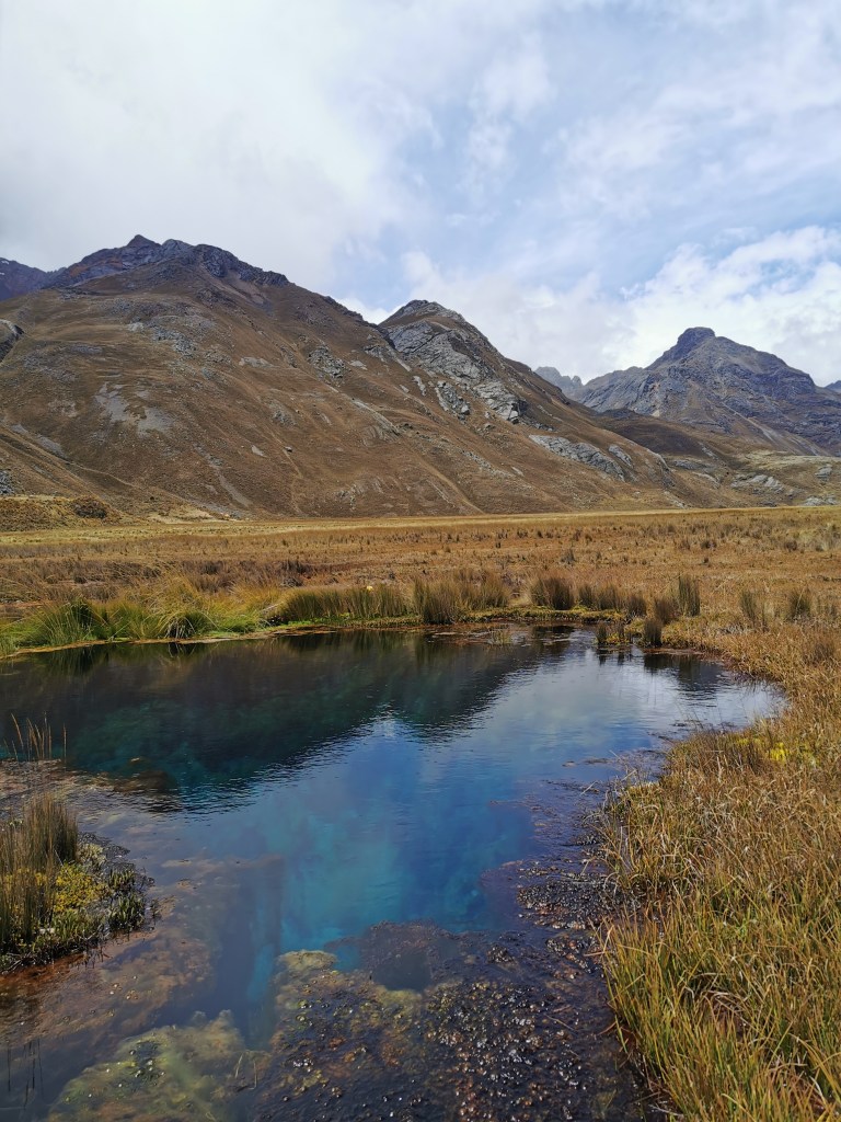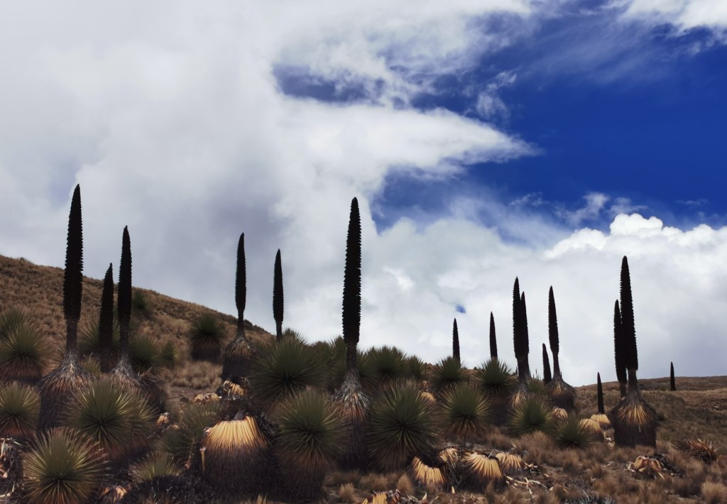 This stop occurred in the Huascaran National Park in a large plain called Pumapampa. At this point the weather was still reasonable, so we could enjoy the views as the plain spread to high mountain peaks all around. There were also two interesting aspects to the exact place we stoped. The first was Pumashimin lake, also known as the Lake of Seven Colours. In reality it is not as grand as its name makes out; it is just a small pond. But it did look beautiful when then sun shone on it, revealing varying colours in the water. Just up the slope from the lake was the second feature. It was multiple large plants called Puya Raimindii. These plants are very rare, only existing in the wild in small areas of upland Peru and Bolivia. After they reach 50-60 years old, they start sprouting something called an inflorescence (according to Wikipedia). This can make the plant up to 15m tall. Although we didn’t see any that size, they were still pretty huge. Once the plant finishes growing upwards, it flowers once and then dies. Growing so tall is the last effort to be able to spread its genes far and wide.