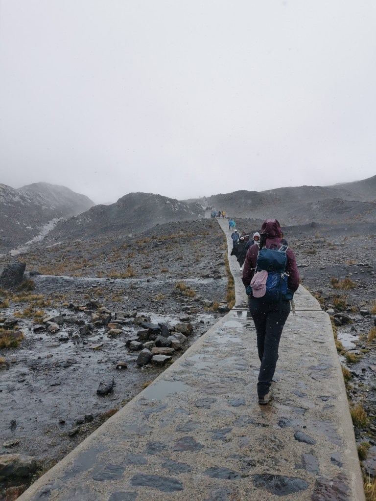 We spent about twenty minutes at this stop before heading to the start of the walk to the glacier. This walk took about 30-40 minutes along a well defined pathway. It wouldn’t have been difficult if it hadn’t been at such a high altitude and if the weather hadn’t have gotten worse. As we trudged along it varied between rain, sleet and snow, meaning it wasn’t the most pleasant of walks. Thankfully we had waterproof jackets and gloves and were wearing our hiking boots. Others on the path, that seemed to be mainly Peruvians on holiday from the cities, were not appropriately dressed and looked absolutely frozen!