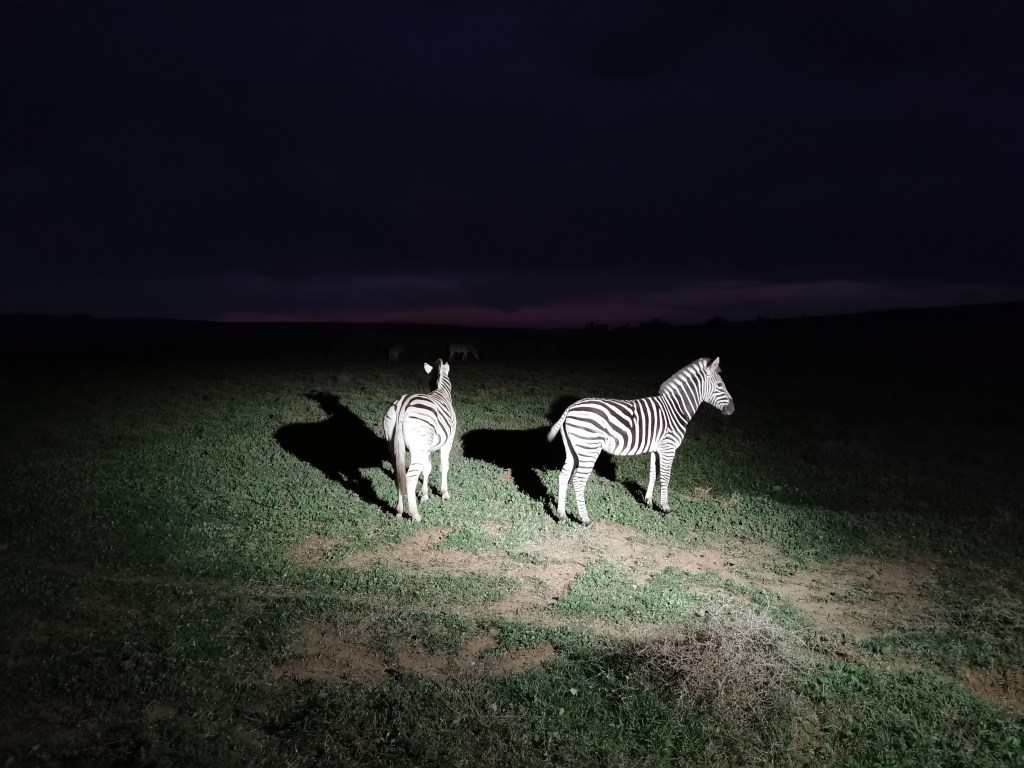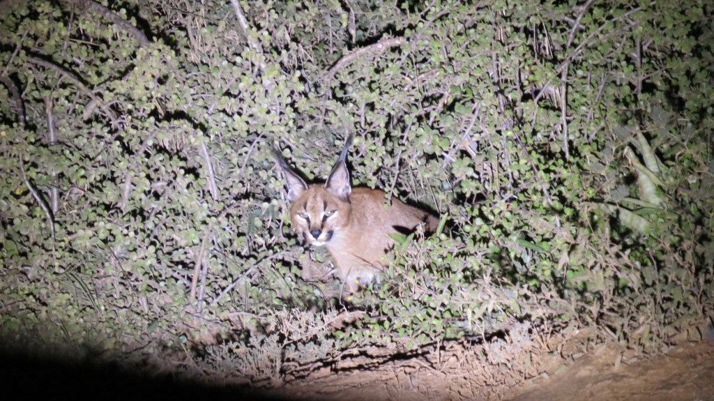 As it became dark, it became much harder to spot anything, even after turning on the spotlights at the sides of the vehicle. We did however startle some zebras that were by the side of the road and we got our first glimpse of an elephant. We were very excited at this given that it was our first one, but in hindsight, it was much better and easier seeing them during the day. Our one big success in the darkness was spotting a Caracal. This is the biggest of the ‘small cats’ and is very elusive, so we counted ourselves very fortunate. Not long afterwards we headed back to the camp, tucked into some of the snacks that had been provided with the tour, and got an early night in preparation for our sunrise tour…