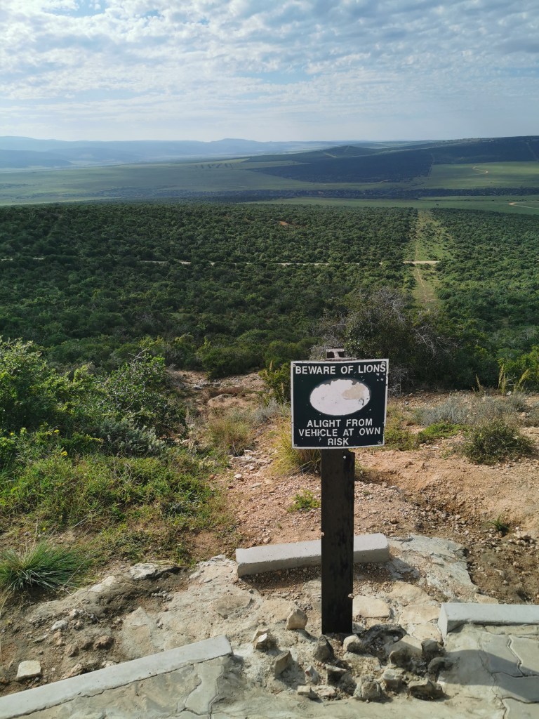 We started by driving round the Nzipondo Loop before carrying on a bit to the Gwarrie Pan and Rooidam waterholes, where there were lots of antelope having a drink. We then backtracked slightly and took the road to Zuurkop Lookout Point. Once you have left the main camp you are not allowed to exit your vehicle apart from at designated points. These places are normally walled enclosures of some kind, sometimes housing toilets or places to sit and have a snack, but there are also lookout points, which are totally open – but are deemed safer, presumably because of the specific locations or because you have a good view around yourself. It was still slightly unnerving, however, to get out and stretch your legs next to this sign…