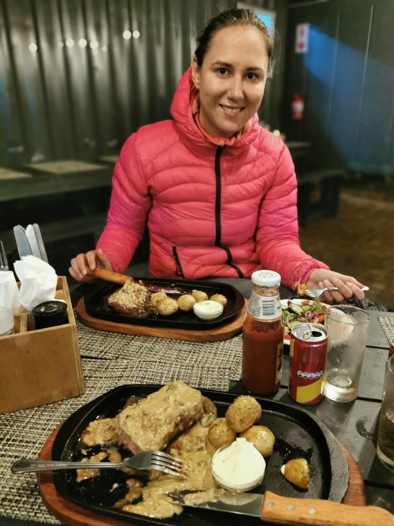 Due to arriving quite late on our first evening we didn’t really want to cook, so we decided to try out the restaurant. The whole site was quite spread out along the coast and given that we were at one end and the restaurant was at the other, it meant that it would have been a couple of kilometres walk. Given the time and how hungry we were, we decided to be very lazy and drive within the site to the restaurant. I paid for my laziness, however, as the restaurant was under reconstruction and the replacement was an outdoor space between some large metals shipping containers. Due to driving I hadn’t thought to bring a coat, so I sat there freezing waiting for the food. Luckily the meal was worth it. The restaurant specialises in steaks, so we each got one with different sauces and they were both delicious! So we’d definitely recommend having a meal there if you’re staying at the site. Afterwards we headed back and fell asleep to the sound of the waves crashing against the shore.