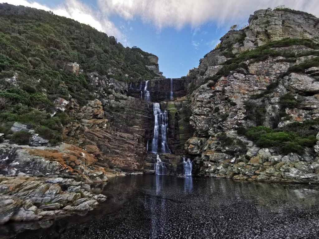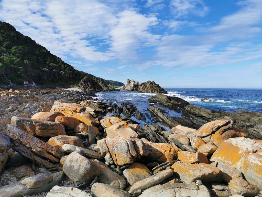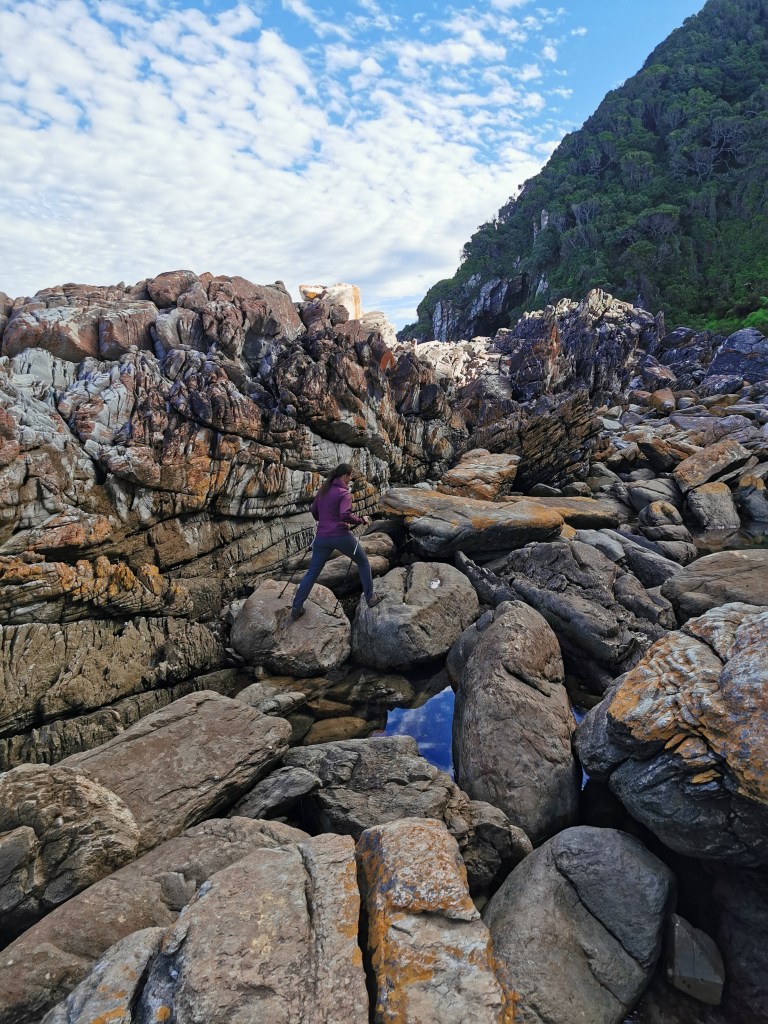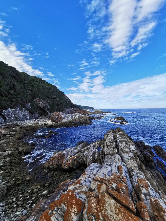 The Waterfall Trail is the first few kilometres of the famous Otter Trail, and it leads from the Storms River Mouth Rest Camp and straight along the shore until you reach the famous Tsitsikamma Waterfall. This marks the furthest you can go along the path without having a permit to hike the Otter Trail. We joined about half-way along the Waterfall Trail and we were immediately required to start clambering over boulders and make our way around little bays in the shore. It was harder than we had expected, both physically and in terms of finding the path, but it was also very picturesque and we enjoyed the scrambling after the drudgery of the forest.