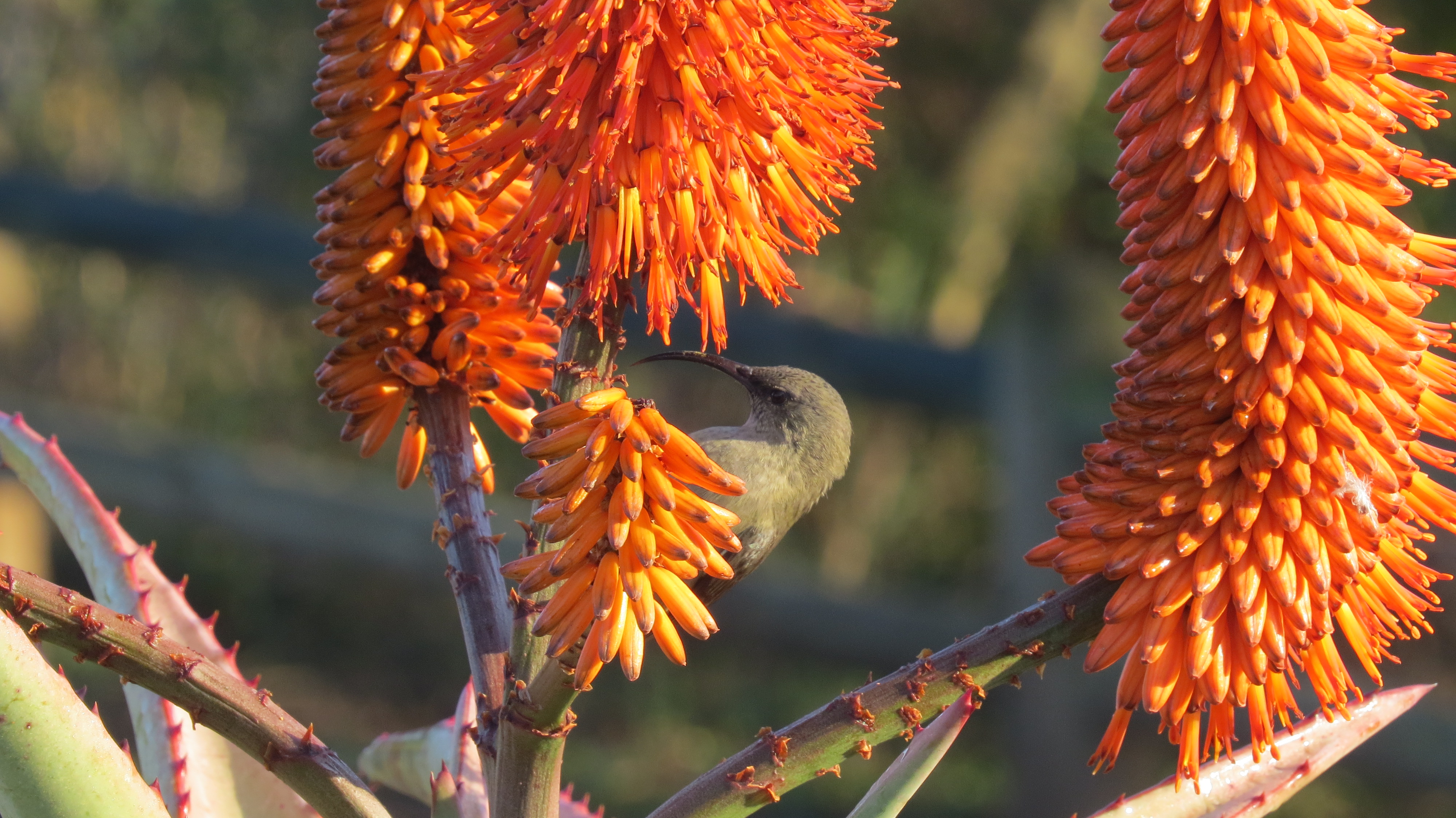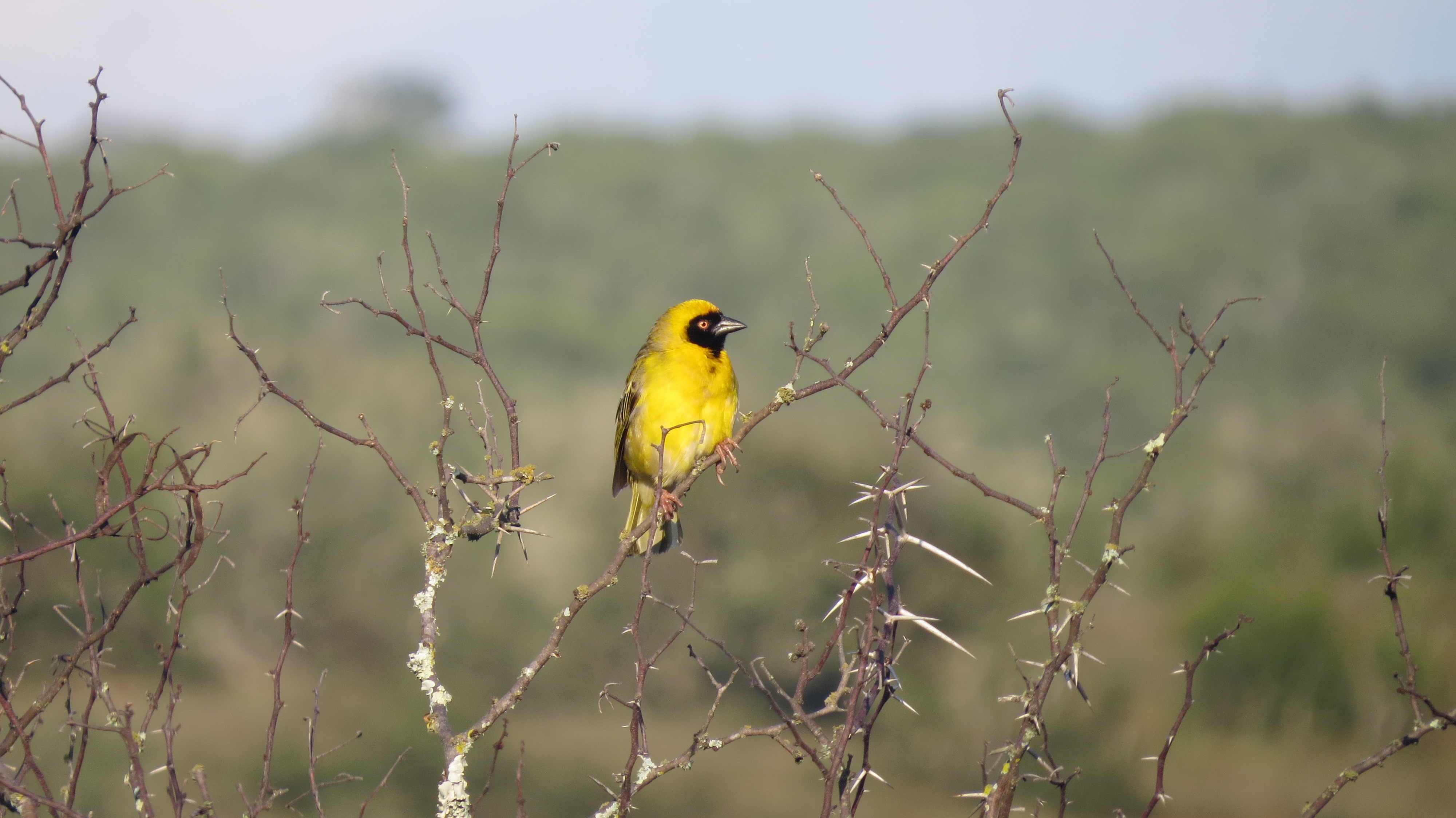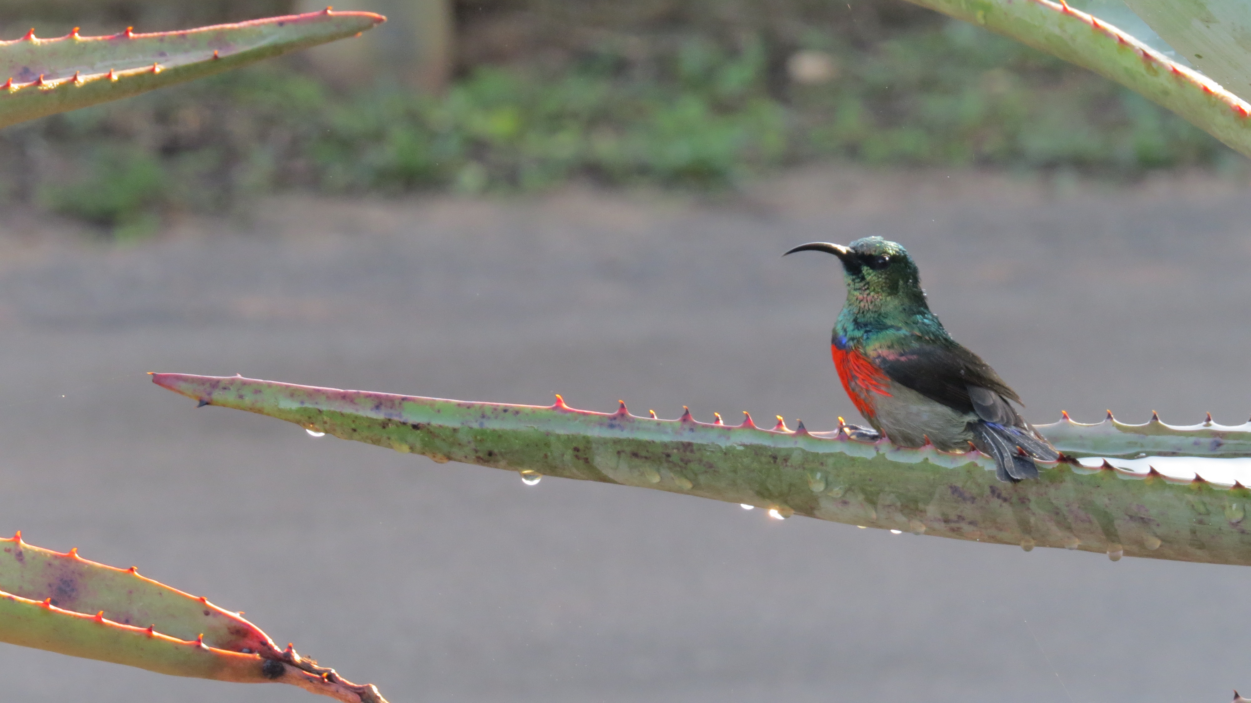 After returning to the camp we spent a bit of time at the bird hide there, where pretty yellow birds flitted about the reeds (they were some types of weaver) before Radka headed back to our chalet. I stayed a bit longer and then on my way back a male bushbuck ran across the path, and then in the decorative plants by the side of the track a beautiful greater double collared sunbird was having a bath in one of the upturned leaves. When I got back Radka was sitting on the patio watching the meerkats who had all been stood up in a row scouting the area. It was a shame to have missed it but the sunbird was a pretty good alternative!