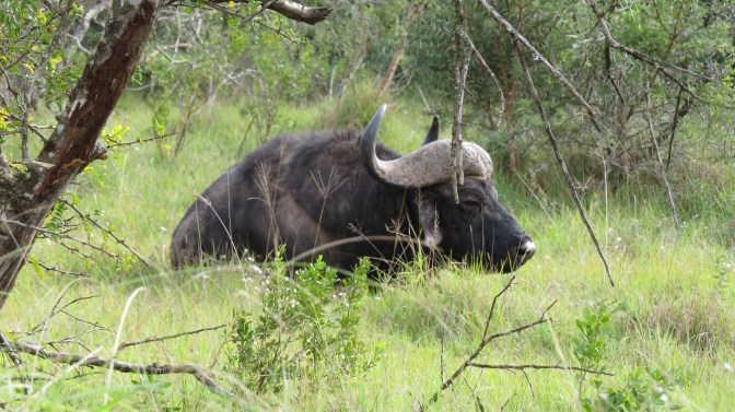 Second Day – Despite sleeping well it was still hard to get up for the sunrise tour! We strapped on our head torches and made of way to the meeting point at reception. As we were heading up the track, a female bushbuck suddenly ran in front of us, maybe ten metres away. Even though the camps are safe to walk around, it doesn’t mean that you won’t come across some wildlife, especially different types of antelope. The first part of the tour was quite anticlimactic and wasn’t helped by the heavy cloud cover which meant we didn’t even have the moon or stars to help light the surroundings. We were both very keen and were intently searching behind each bush and tree as the spotlights passed over them, but during the first hour or so we didn’t see anything apart from a few scrub hares and a couple of zebra that we woke up with our spotlights. Our concentration was waning at this point when a spotted hyena materialised out of the darkness, ran round the back of our truck and then melted back into the shadows. It just went to show that you can drive around for hours not seeing much, but you never know what’s coming. When the light came it was better, and we saw our first buffalo and ostrich, so we were able to put a tick next to a few new animals. We also got a much better look at some black-backed jackals, which we’d seen the night before but only at a distance in the gloom.