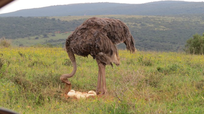We decided to do one more loop before heading for the exit, and we’re glad we did as there was a lot to see on the Vukani Loop. First was a yellow mongoose standing on its hind legs looking around, and later on we saw two ostriches. As we got closer to the female one, it turned out she was guarding a load of eggs, with the nest being right next to the road. After a while, the male ostrich came along and took over the protective duty whilst the female went off to feed. It was very cool to watch this interaction, and yes, the eggs are massive! Further along the loop there were a load of kudus and that was our last major interaction before heading for the exit.