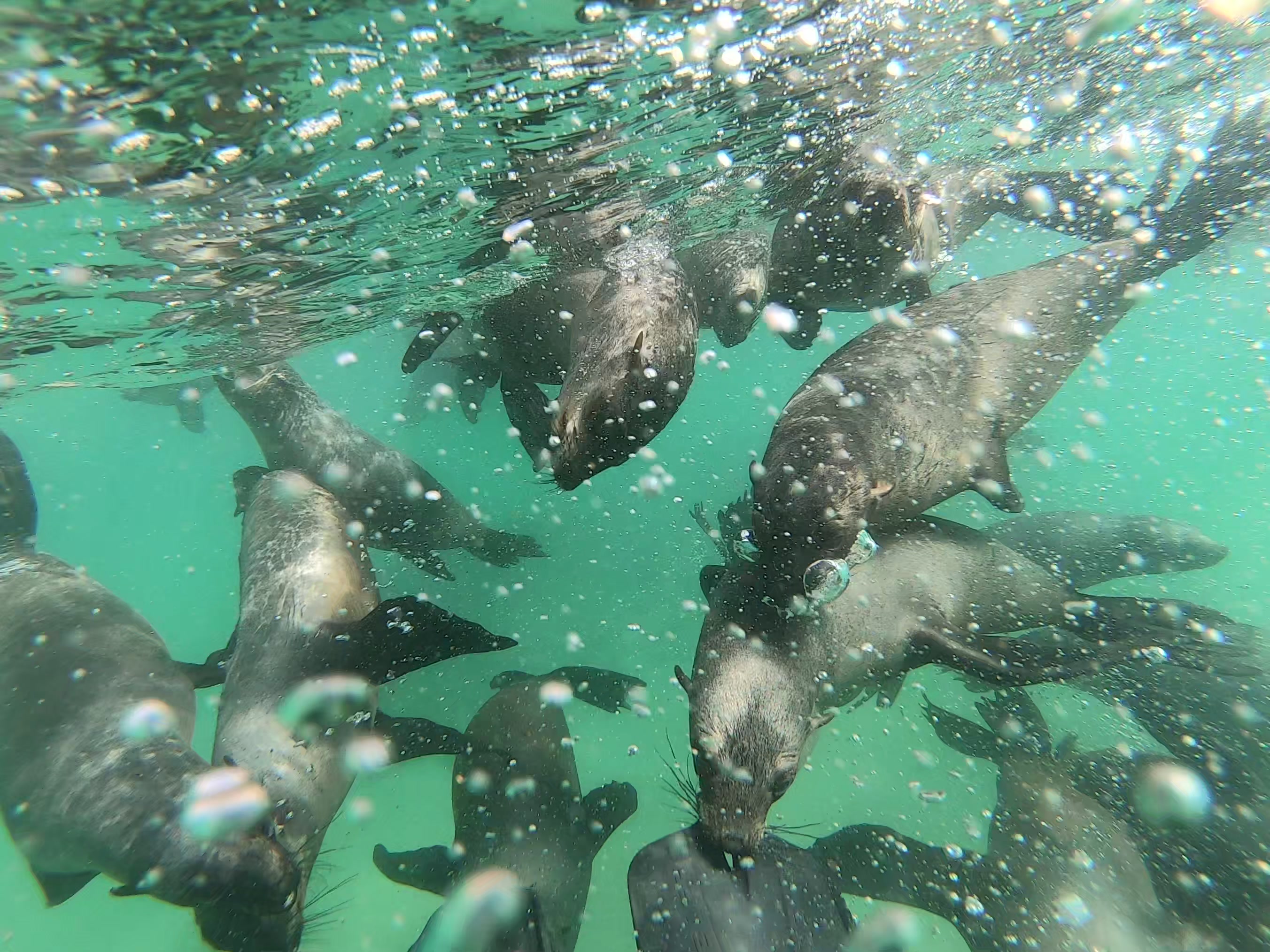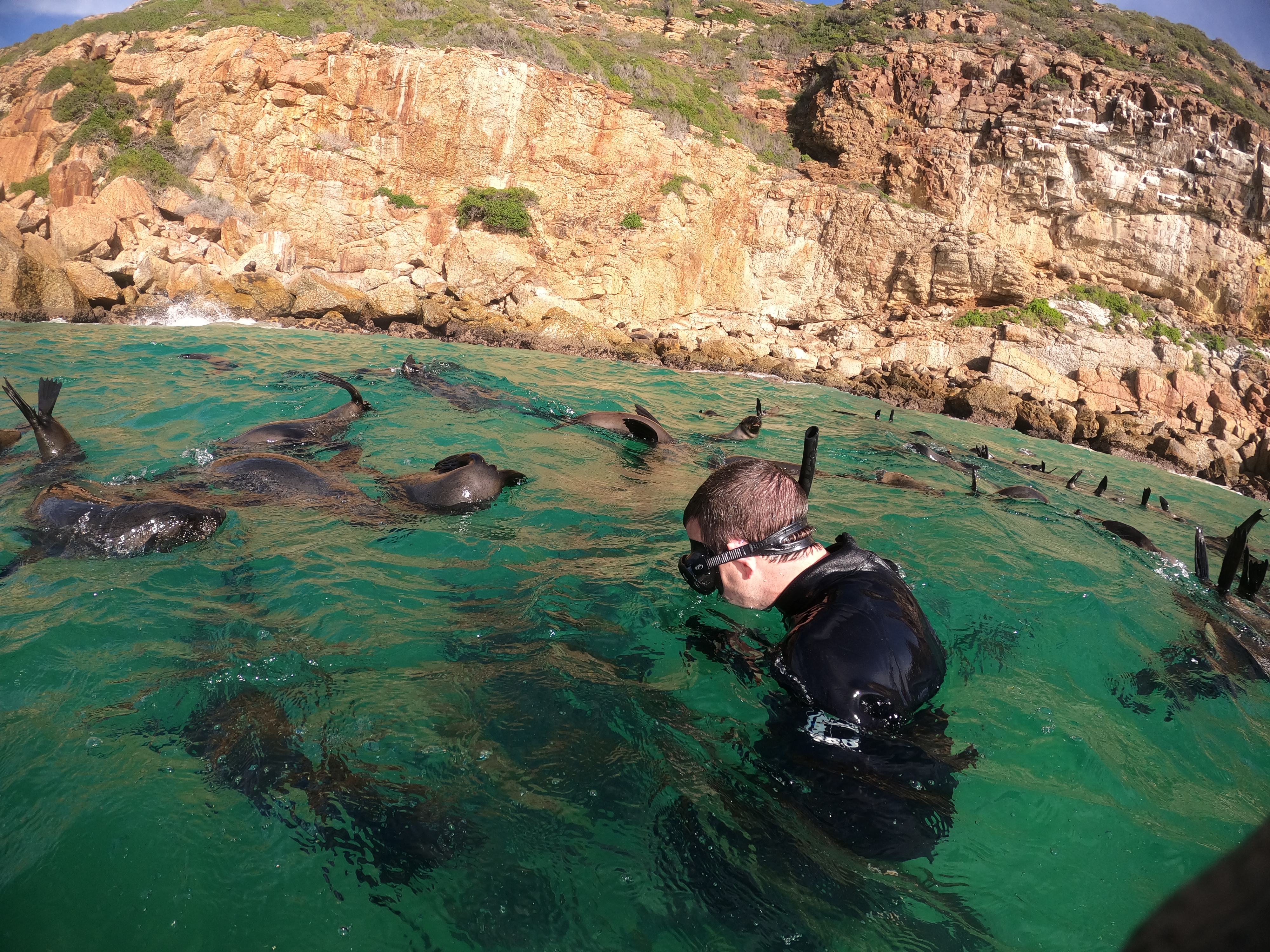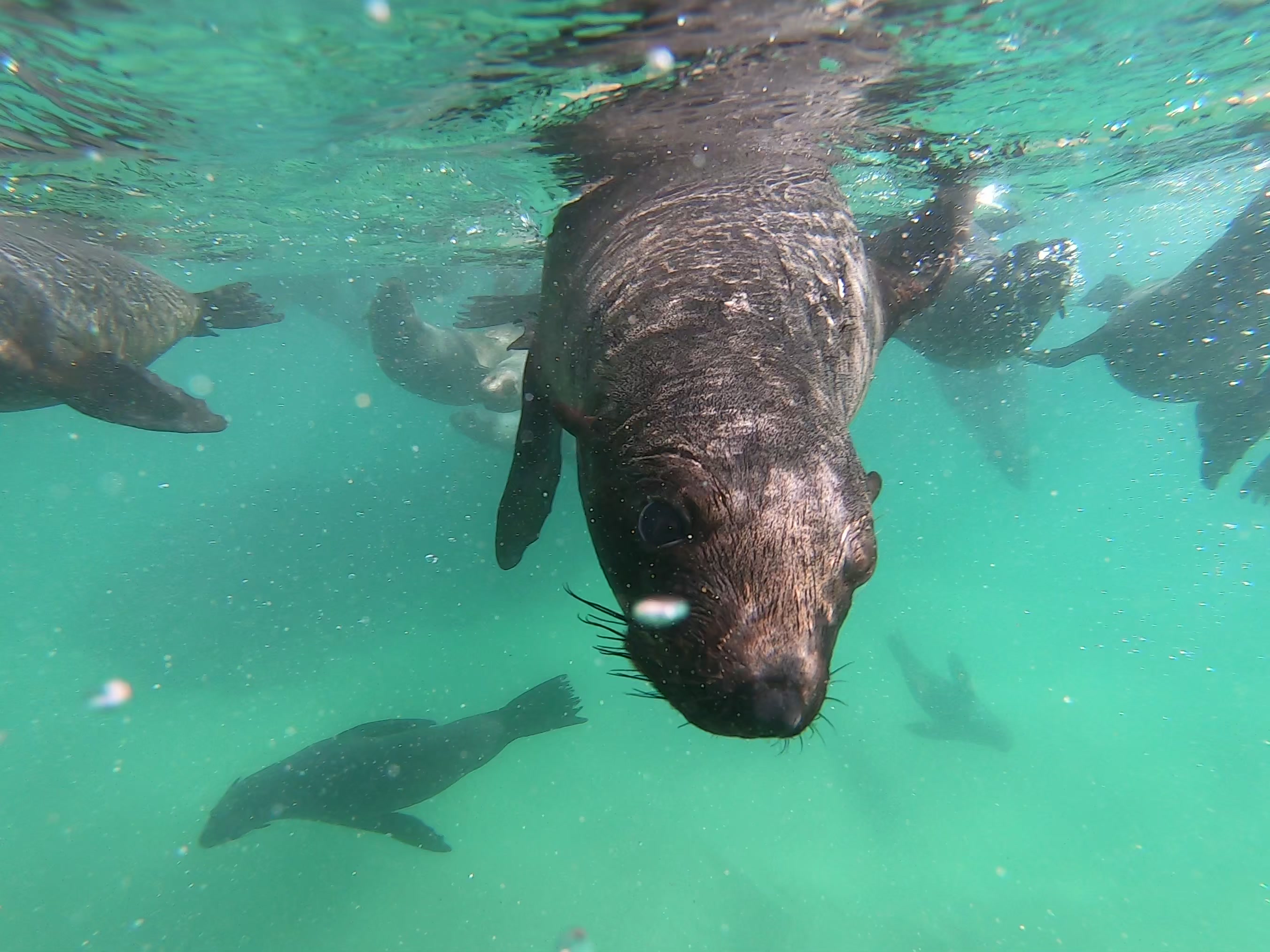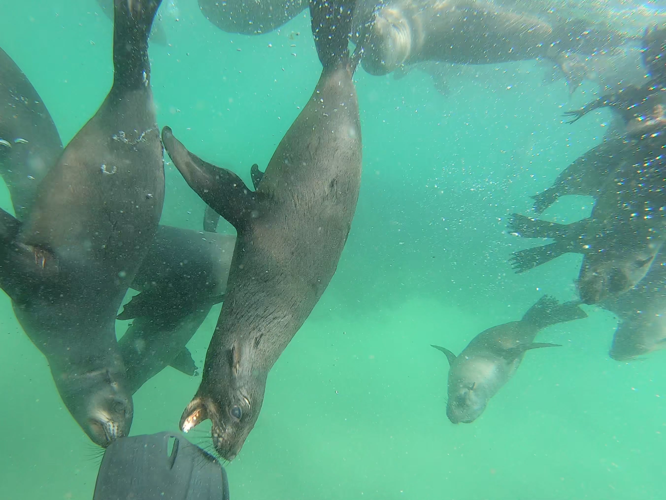 When we got back it was time to get changed for the second activity – swimming with seals. After donning wetsuits we went out in a smaller boat and headed straight for the cliffs. There are thousands of seals that live on those cliffs and there were dozens that we swam with. It was really good fun. They were constantly swimming around you and repeatedly trying to bite and steal your flippers. I got a couple of nips on my ankle by mistake, but nothing that broke the skin, mainly due to the extra protective coverings that are added to the wetsuits around your hands and ankles. Although when you looked down at the seals they morphed from these cute, playful animals into looking a bit scary when they bared their teeth whilst biting the flipper. It reminded me of those BBC documentaries with the vicious leopard seals hunting the penguins.