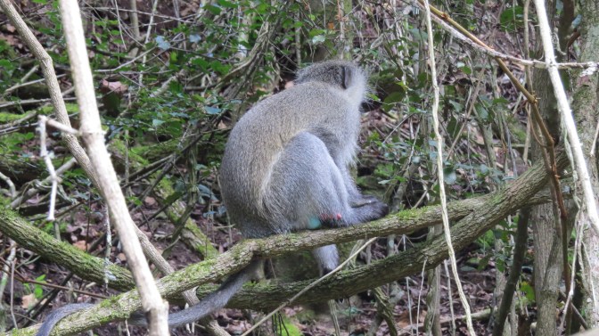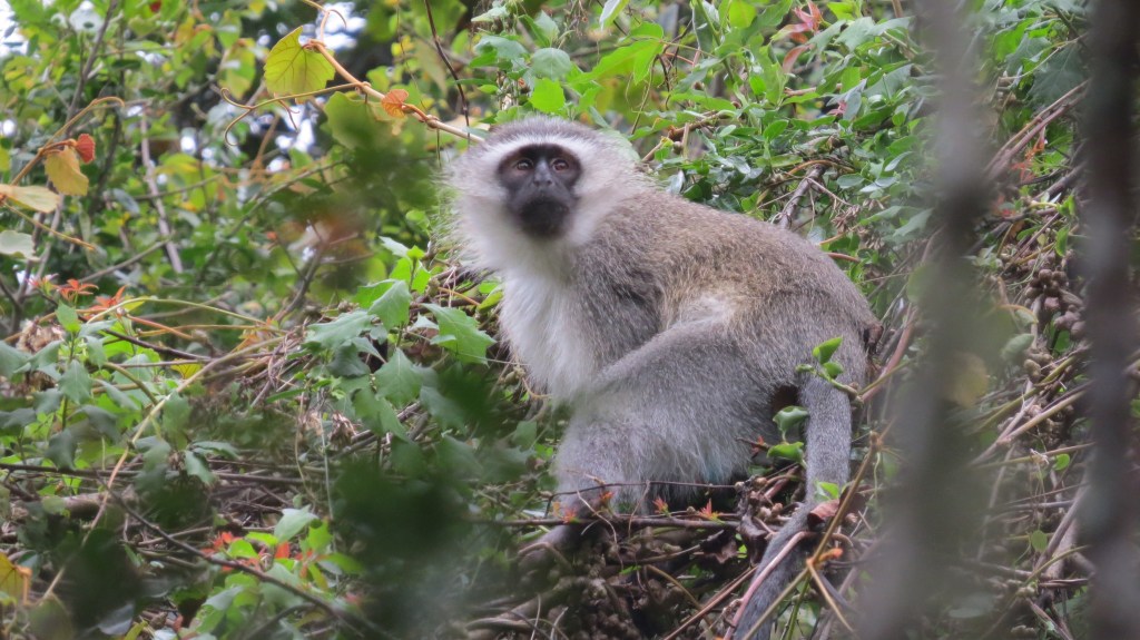 The start of the walk was pleasant enough as we meandered along the river but it soon livened up when we were suddenly right next to a small troop of vervet monkeys. I literally just looked to my left and there was a monkey climbing a tree not three metres from me. There was one youngster amongst the group and it was pretty funny to watch it clambering amongst the branches and trying to play with the adults. We watched them for a while as they passed through the trees around us and crossed the path on the branches overhead. This encounter really improved our opinion of the trail!