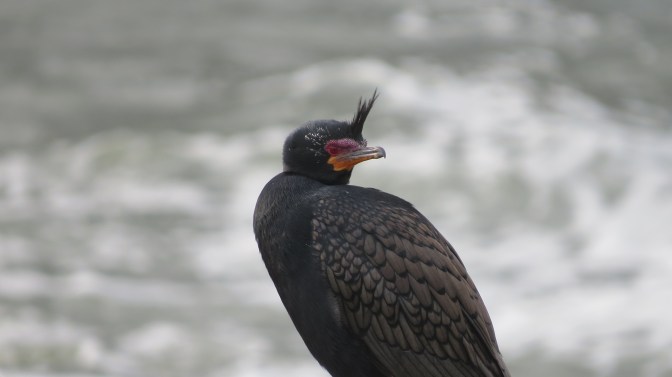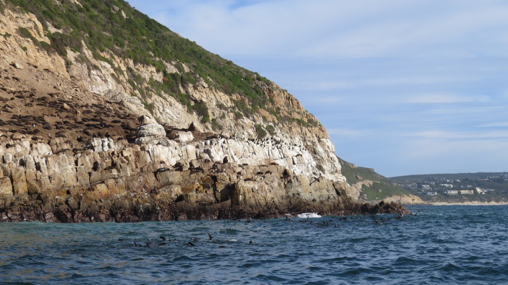 We didn’t get our confirmation for our activities until just before eight AM but fortunately everything was going ahead. We drove there, passing some pretty misty scenery on the mountains and got there in plenty of time. First was the whale watching trip. Plettenberg Bay isn’t as well known for whale-watching as Algoa Bay or Hermanus, but we’d already had to move on from the former and given that the forecast for when we would be in the latter looked dodgy at best, we thought we’d better give it a go in Plettenberg whilst we had the chance. We had a high level of anticipation for this activity given how many whales we’d seen from shore at Storms River Mouth but the trip turned out to be largely anti-climatic. The most exciting part of the first 95% of the trip was getting the boat into the water, which required a tractor to drive quickly and then stop, causing the boat to be launched across the sand and into the water. We then had about two hours of nothing. We did see the spray from a whale fairly close by, but because it was ‘only’ a smaller Brydes Whale, we didn’t investigate, as they searched for humpback whales. They failed. This was a shame, as we’ve never seen a Brydes Whale, so we would have been very keen to get a closer look. I think as compensation for the lack of sightings, they returned via the cliffs to see the seals, but given that we were coming back in our second activity anyway, I couldn’t shift the feeling of disappointment.