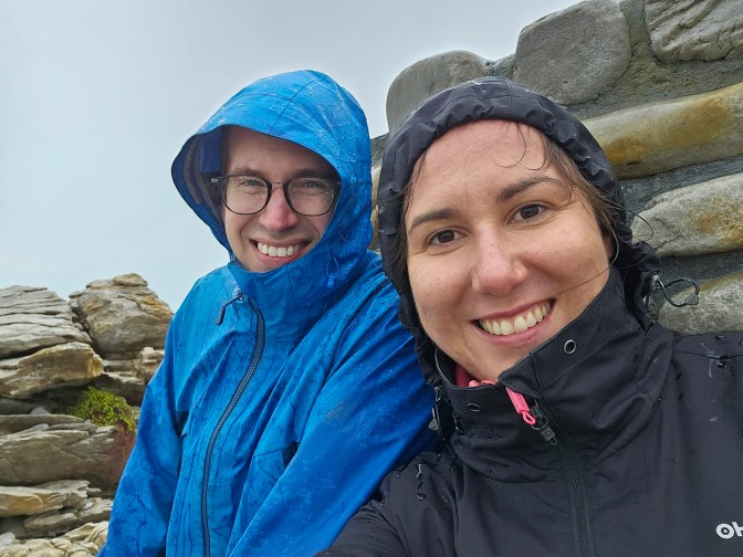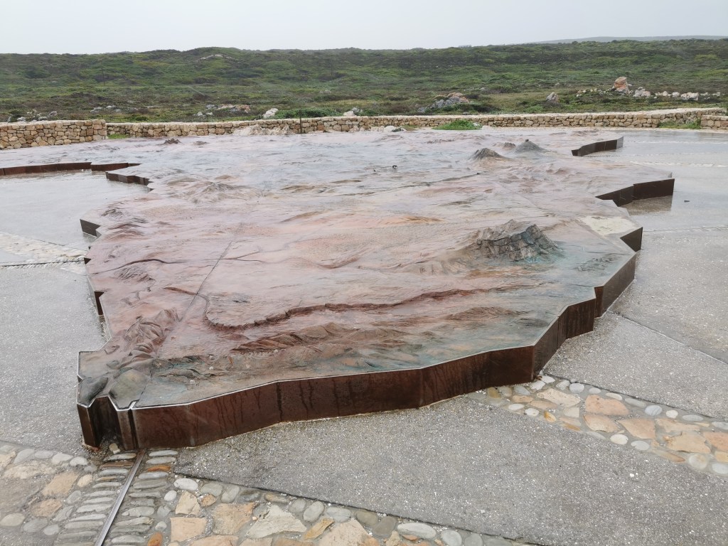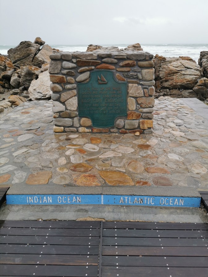 We’re still not sure if we made the correct decision, as the weather was appalling and it is a big detour from the motorway, but I guess it’s quite a cool, niche place to visit. The place itself would have been pleasant enough. There was a rugged coastline and quite a picturesque lighthouse nearby, but those thoughts exited our minds as soon as we got out of the car. We actually though we’d hit a lull in the rain when we parked by the side of the road, but as soon as we’d walked 20 metres it came back with a vengeance and was now mixed with hailstones. So, what could have been a nice visit turned into ‘get there as quick as possible, grab a couple of photos, and get the hell out of there’! As well as being the most southernly point of Africa, this is the point where the Atlantic and Indian Ocean meet, and there is a statue commemorating that fact. We actually ended up hiding behind it until the worst of the hail was over!