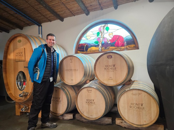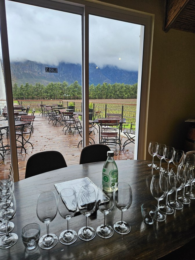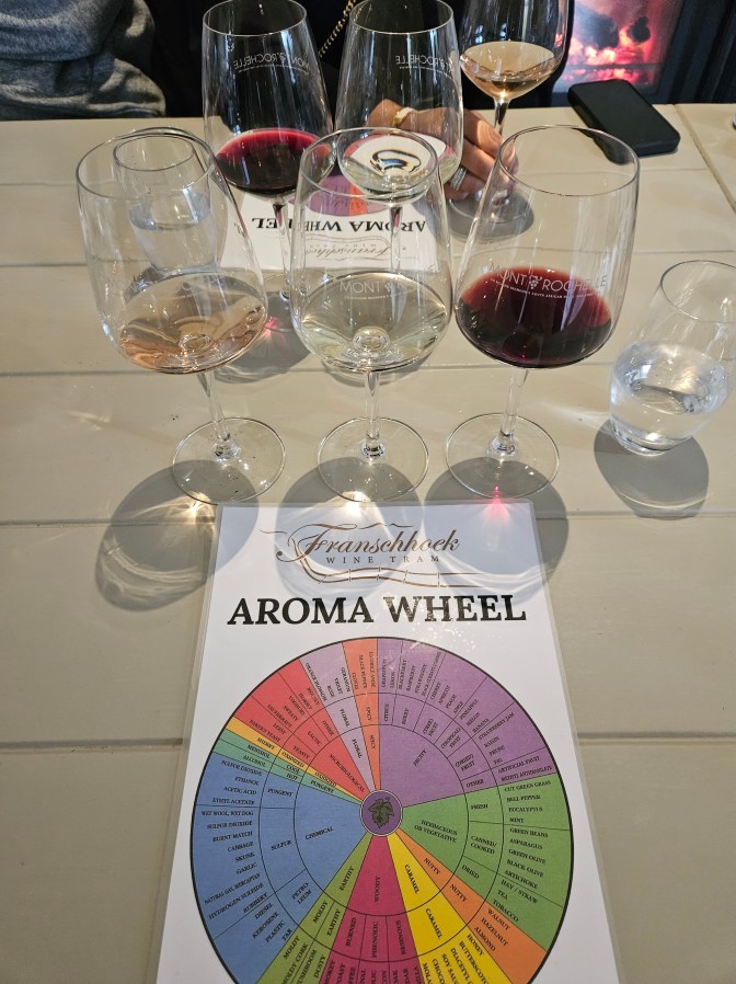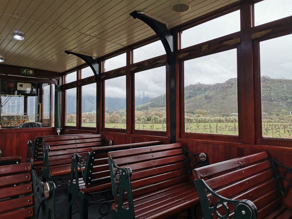 Now, neither Radka nor myself are particularly wine drinkers and don’t really know much about them. But we felt that visiting the wine region near to Cape Town was a must-do activity for this type of holiday. There are loads of places to choose from, and we could even have done day trips from Cape Town, but we decided to just visit one of the towns properly for a couple of nights, and were given a recommendation of Franschhoek. However, nearer the time we checked the weather and it was meant to be atrocious when we were going to be in Franschhoek, so we booked to do a curated wine tasting. This meant that we didn’t have to worry about getting from place to place or working out which estates to visit. We booked it through the official Wine Tram website, where you can also get different types of ticket depending what type of itinerary you want. And given that we hadn’t had a firm idea of where we wanted to go in Franschhoek anyway, we ended up being very happy with our choice to do it in this way.