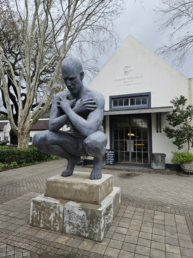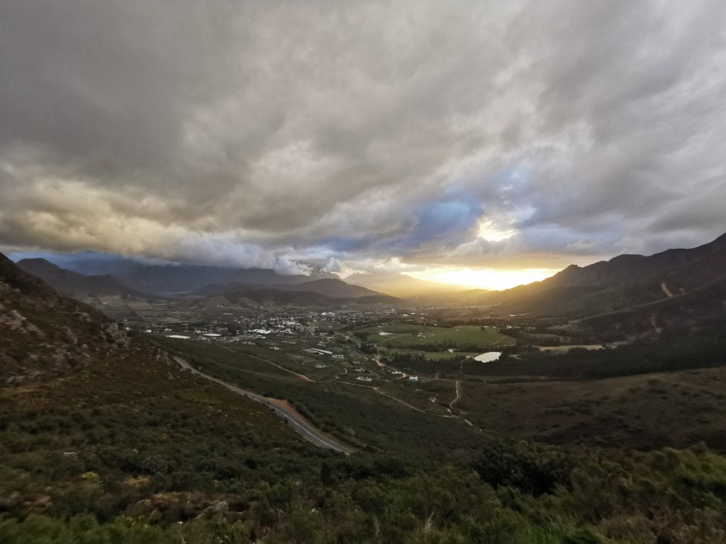 The road onwards towards the famous wine-making town of Franschhoek was interesting, as it got more and more hilly, the rain came and went and then suddenly there were snow-capped peaks ahead of us! The dreary conditions and the nature around actually reminded me of Scotland. It certainly didn’t seem like one of the world’s premiere vineyard areas. But after one more windy pass, we were suddenly looking down into a valley with a small town that was surrounded by vineyards. The contrast was incredible. The Sun happened to be setting at this point so it was a beautiful view.