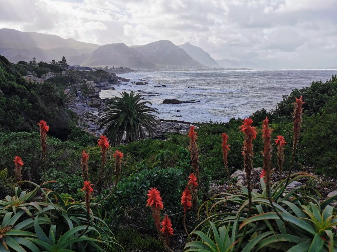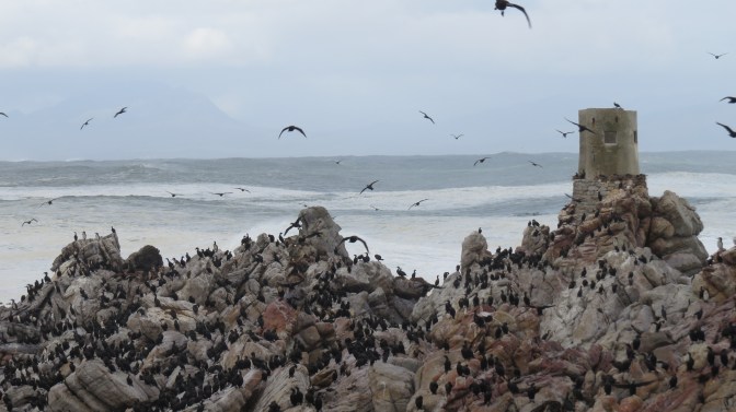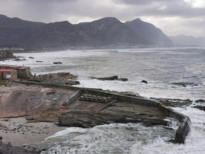 When we were planning our Garden Rote trip, Hermanus is probably the place that we were most looking forward to visiting. It is famous for its whale watching, both on boating excursions and simply from the coast. They even have an old tradition of someone ringing a bell when you can see a whale out to sea. However, when we were arrived in South Africa and were solidifying our plans, the predicted rain and wind, combined with the effect this would have on the ocean swells, plus the fact that our first trip in Algoa Bay was cancelled, suggested to us that there was little point in spending too much time in Hermanus. Hence, we only spent one night there, and the patchy weather and raging seas vindicated our decision. Nonetheless, what we saw in our short time there left us in little doubt that this could be a fantastic place to visit in different circumstances.