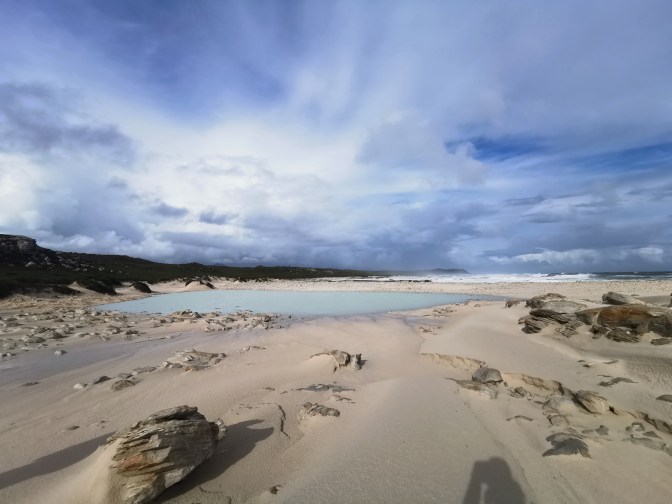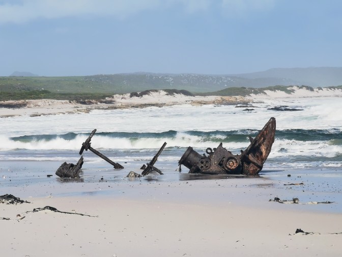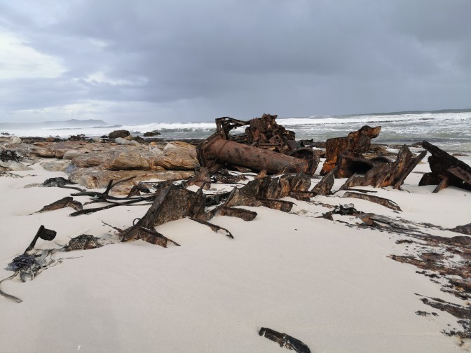 Olifantsbos Beach to do the Shipwrecks Trail – The following day we headed back to the national park with the hope of actually doing one of the trails. The weather was still dodgy, so we started out a bit sceptically. It didn’t help that the path was flooded, so we had to make our way around and over the rocks and flora. It drizzled a bit but then got out quite nice as we alternated between the shrubbery and the beach itself, steadily heading towards the ruin. We actually managed to miss the main ruin and kept on going until we came to the Nolloth wreck. This was quite cool, as the small part that remained stuck up out of the sand. We took a few photos before starting our journey back (we didn’t have time to do the inland route and the paths seemed to pretty non-existent when we looked). Before long I noticed the main wreck along the water line, so went to have a look. This was the Thomas T Tucker, which sank during the second World War. It was spread into multiple pieces and was interesting to see. We got about half way back when the weather turned and the wind drove the rain and hail into us, soaking us through in seconds! We decided to take a road back to be faster. Luckily the extreme weather didn’t last long, and the wind started to dry us out a bit by the time we made it back to the car. If the weather had been more positive, then this would have been a nice walk in its own right. But having the interesting wrecks at the end made it even better. Just make sure you have some sort of offline maps downloaded, as there are next to no markings and the path can be very hard to follow.