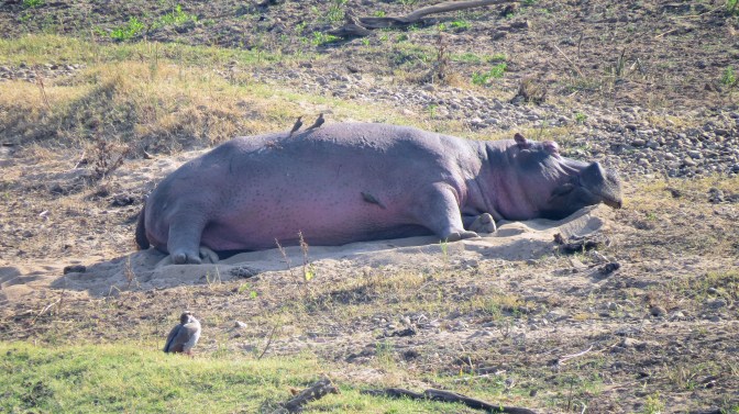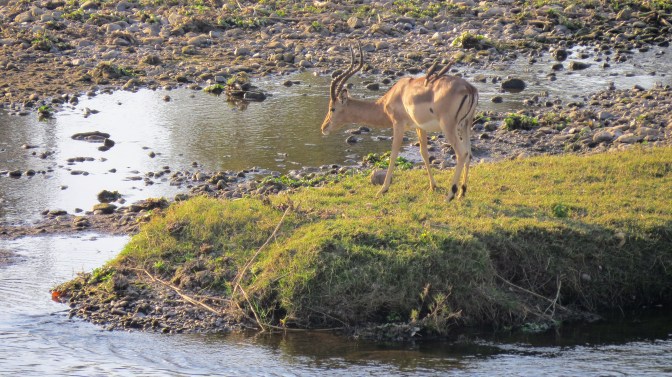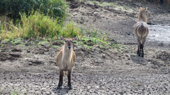 As soon as we got to the viewing area behind the rooms we saw a huge hippo sleeping on the opposite shore. There were also waterbuck, two crocodiles and a couple of impala that lazed around most of the afternoon. In addition, there were also a couple of warthogs that came down briefly, plus another hippo further down the stream. Not bad considering we hadn’t yet even entered the park!