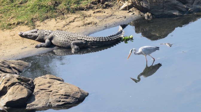 The bridge was positioned before the official entry gate, so we parked just before the gate and had a walk to look out over the river. Already at this point there was a swathe of wildlife. On one side were elephants crossing the river, on the other a large herd of hippos were feeding and enjoying the water, whilst right below us were at least a dozen large crocodiles. This is in addition to the waterbucks that were lazing under the trees to the side and the birds that were on the look out for fish. The herons and egrets seemed to have no fear of the crocodiles as they casually sauntered past, whilst we enjoyed watching a kingfisher hovering above the river before suddenly swooping down to grab its prey.