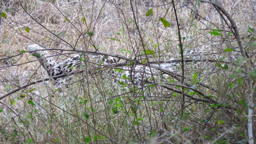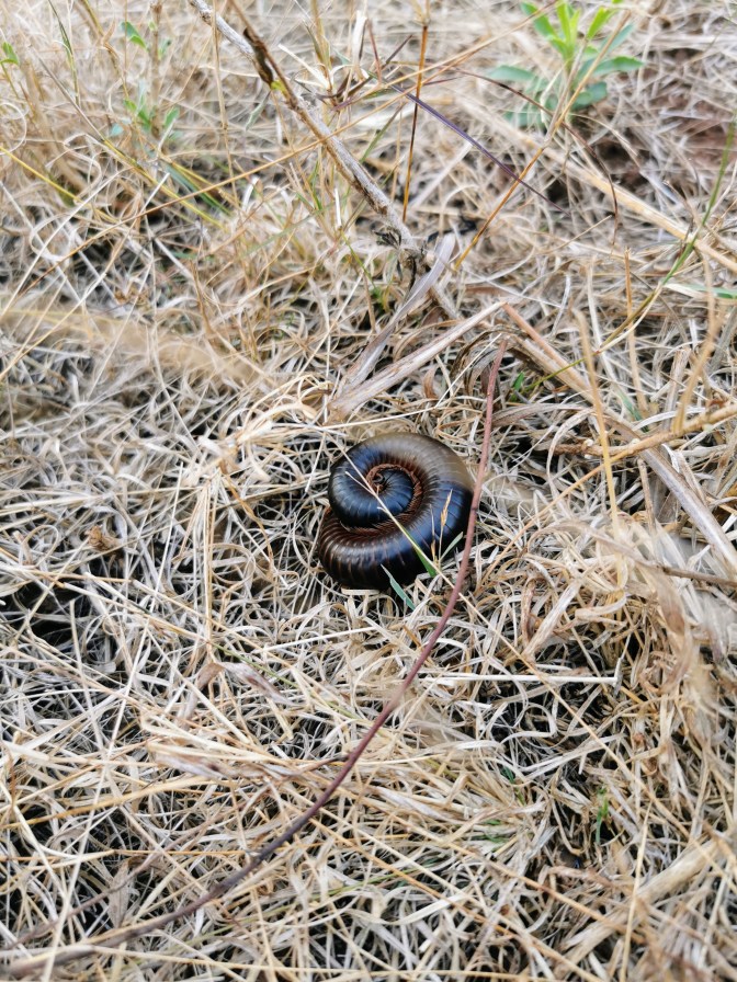 After reaching our destination, we had a safety briefing and then we were on our way. We walked in single file with the guides leading the way with their rifles slug over their shoulders. Every now and then they’d signal and the first person in the line would move to the side, let everyone past, and then join again at the back, so there was a repeated changing of position. The first part of the walk was reasonably quiet in terms of sightings but we’d make stops so that they could talk about something to do with tracking or the environment we were walking through. These stops included talking about different plants, checking out a large millipede that was curled up next to the path, and identifying tracks and droppings left in the soil. The droppings were probably from a hyena and we discussed how animals that eat grass have darker droppings, whilst those of animals that eat leaves are lighter due to the tannins. The paw prints turned out to be a leopard, with cats having three bumps at the back and wild dogs having two. It was both cool and a bit disconcerting that there had been a leopard on that path fairly recently. Whether or not it was still in the area, we did not see it during our walk. But we liked to think that it was there somewhere watching us…