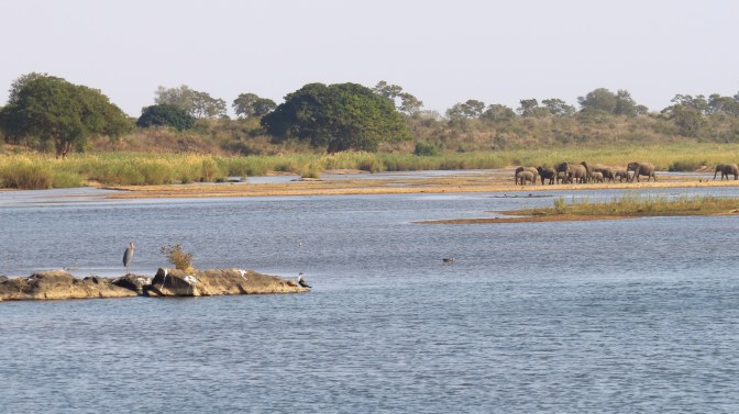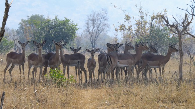 We stopped under an isolated tree for a break and a snack but after a bit the guides became very worried and started quickly getting everything packed, as they had seen a herd of elephants heading in our direction. Luckily the herd changed their path slightly, whether or not that was because they had detected us, we don’t know. But given that a few members of the herd raised their trunks into the air, it suggested that they had. This is apparently what they do to get a better smell of what is around them. I’d never seen this before and it looked very funny, like they were submarines raising their periscopes.