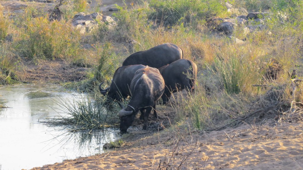 The rest of the drive that day was rather over-shadowed by what we’d just seen, but it was still nice to see the buffalo congregating by the watering hole, watch a hyena scuttling past amongst the long grass and get our first glimpses of the beautiful lilac-breasted rollers amongst the trees. Despite not travelling that far in total during the day, we only just made it to the rest camp before closing time. So please make sure that you always have more time than you think you’ll need as you never know what will happen and what you might see that will hold you up. More on that later…