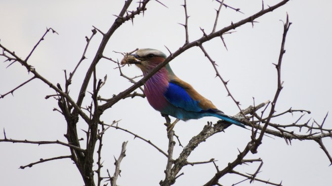 The route started pleasantly and the picnic site was a nice place to stretch our legs and nip to the toilet. It has a great view over a lake, but it was unfortunately empty of wildlife when we were there. As we carried on we saw more elephants and at one point a lilac-breasted roller dove right in front of the car to snare a grasshopper before flitting off to a tree. This was our first ‘successful hunt’ that we saw but not the last…