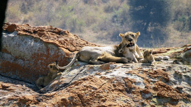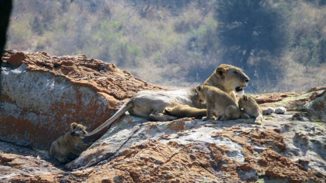 After returning to Lower Sabie for lunch, we headed north west on the road to Skukuza Rest Camp. The journey started quite quietly, although still with sightings of antelope and eagles, but after an hour we came up to a few cars on the side of the road. There turned out to be a lion with her cubs sunning themselves on an outcrop of rock. From our position we just had an angle to see them and they were on the outer reaches of our binocular and camera ranges. It was times like these that showed just how important having a good pair of binoculars or a camera with an excellent zoom really was. As the time we spent watching the interaction of the family was easily one of the highlights of the whole trip. The mother was snuggled up with a couple of the cubs whilst another practised hunting by jumping and biting at their mother’s wagging tail. It was just a real privilege to be able to watch it happening.
