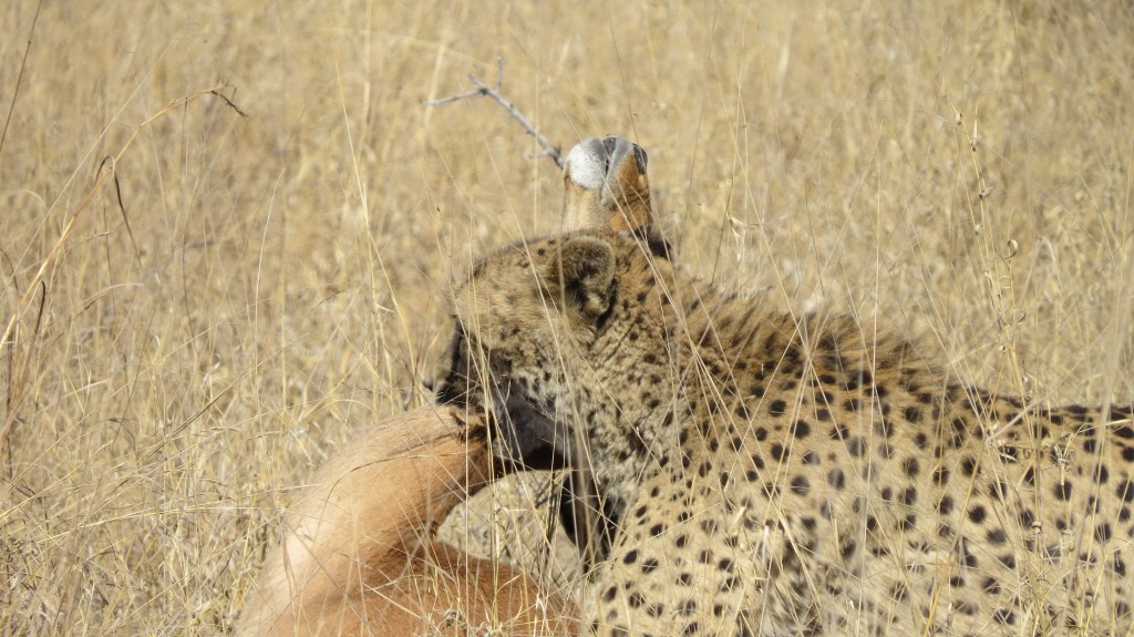 As the cheetahs strode on, the cars would all start driving in a procession and stop a bit further along the road and wait for them again. Due to our place at the back, our positions ended up being relatively poor, with only fleeting glimpses from inopportune angles. So after joining the car procession a couple of times, we decided that we were really happy to have seen a cheetah but that it was worth taking a risk to get a better view. So, we left the group of cars behind and carried on the road looking for an open area where we could stop and wait. After a while we came across a herd of antelope and thought that their movement could indicate that the cheetahs were approaching, So we stopped by the side of the road and waited. We had no idea if the cheetahs were still walking or if they were still heading in this direction. We waited for quite a while with absolutely nothing happening and no other cars catching us up. Only one car came from the opposite direction and asked what we were waiting for. Our attention was actually waning and then suddenly, there was pandemonium everywhere. I first looked in the direction I was expecting the cheetah to come from, saw nothing, and yet there was now a cheetah running directly towards us from another direction, leaping and taking down a large antelope maybe 20 metres away, right in front of us. From everything being still and nothing happening to a cheetah being on the ground with its jaw clamped on the throat of the antelope had taken less than five seconds. The poor beast was dying right in front of us and yet we couldn’t look away. It was thankfully over pretty quickly, the cheetah an expert in efficiency, and yet it stayed there in position for quite a while, just making sure. We could see the hair on the cheetah still standing on end and its chest heaving from the stress of the sudden exertion. I think we were in shock. We couldn’t quite believe what we had witnessed. Other cars started arriving at this point, but even with the choice of where to park, none of them had as good a view as we had. Radka was quite emotional with what she’d witnessed whilst I just couldn’t process it. Had we contributed to the kill by blocking off an escape route? Had the Cheetah actually used us as part of its strategy? However unlikely, these were some of the immediate thoughts that hit us. Our collective trance was broken as the cub came bounding from the bushes, obviously so excited and happy. The stark contrast between the happy cub and the fate of the antelope brought into focus the harsh reality of the natural world. Not long after this moment the adult cheetah dragged its catch underneath a nearby bush, obscuring our view and ending the most intense few minutes that I can remember. It took a while to process but afterwards, it dawned on me that if we hadn’t missed our sunset safari a couple of days beforehand, then we probably wouldn’t have booked an extra night, we might not have seen the lion with her cubs the day before and we most definitely wouldn’t have seen the cheetah kill. Even the events of that morning were surreal. We chose to leave quite early; then we decided to take the trail through the park, even though it would take longer; we then decided to leave the group of cars despite getting some views of the cheetahs and then finally we happened to stop at the exact spot of the event. The odds of all of that happening seemed astronomically small. Which all just seemed to support my view that ‘success’ during a safari is much more luck than judgement.