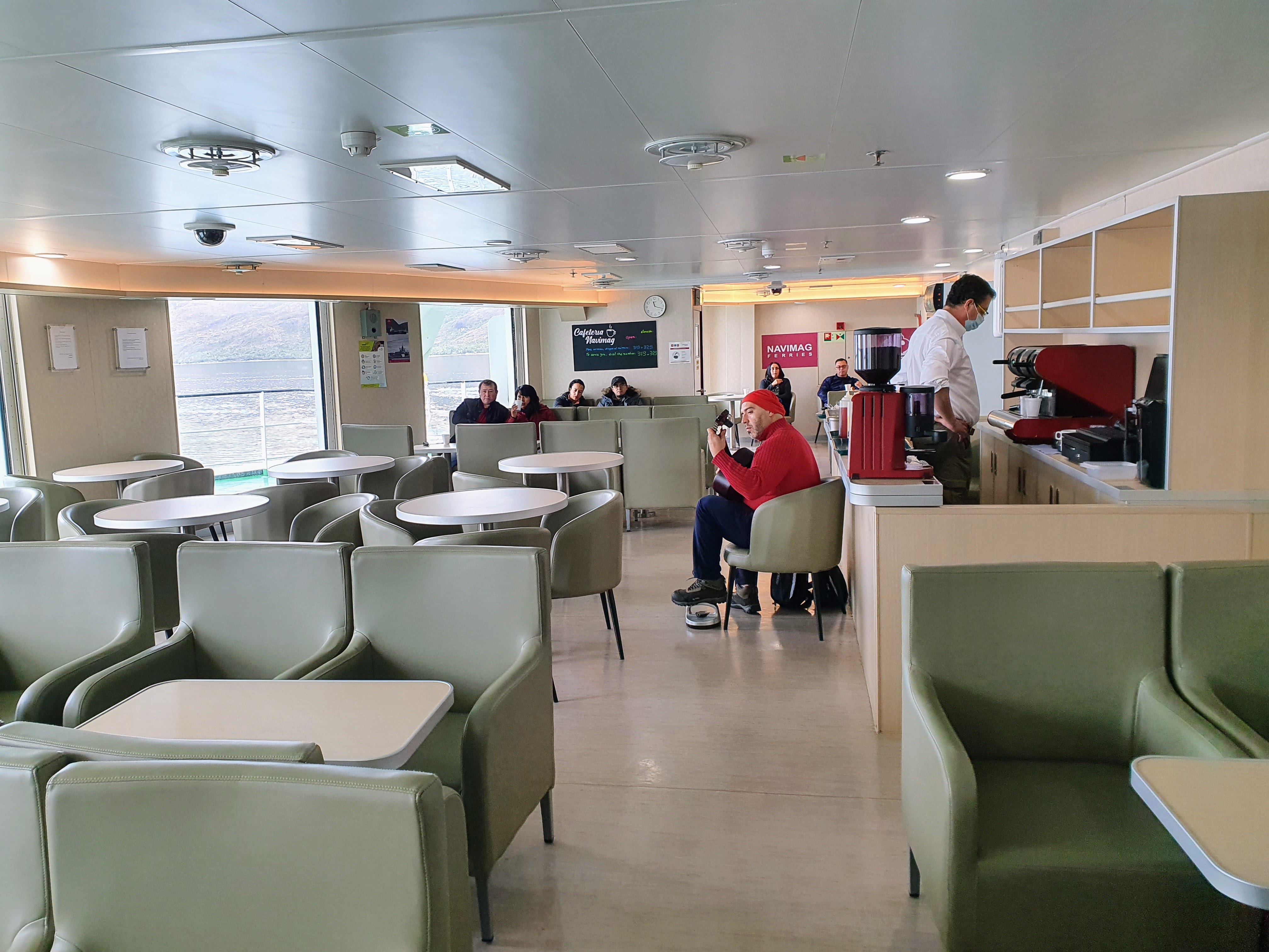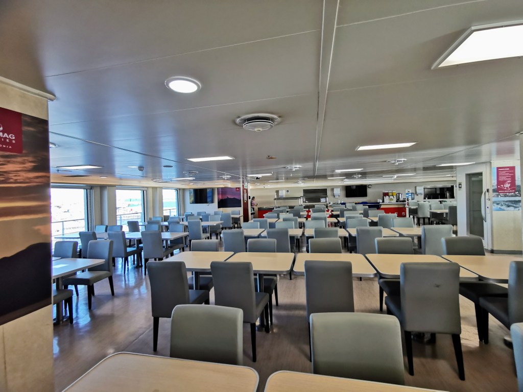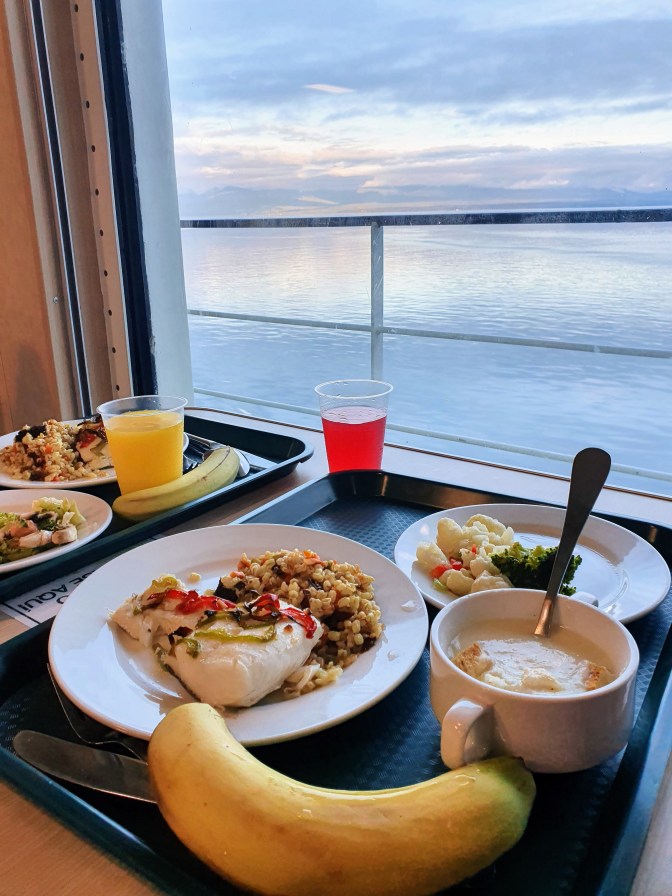 After relaxing for a bit we went to the large dining hall for lunch. We were quite confused at the number of tables compared to the number of people there but it turns out that pre-COVID the ferry would commonly transport between 150 and 200 passengers but for our trip there would be… 16. Whilst not great financially for the company; we certainly enjoyed it being more empty. It meant that we always had access to a window seat during meals or throughout the day and it was easy to walk around on the deck of the ship.