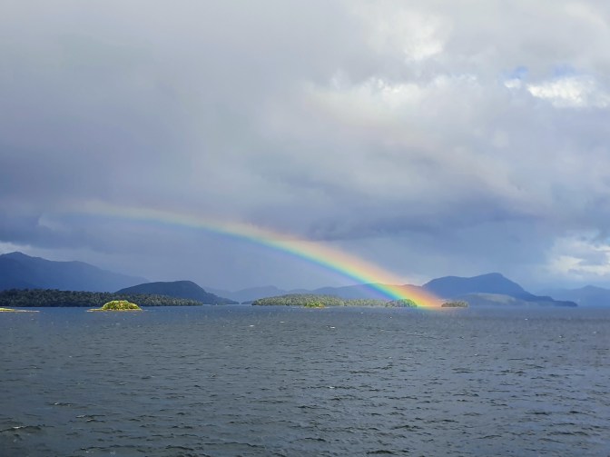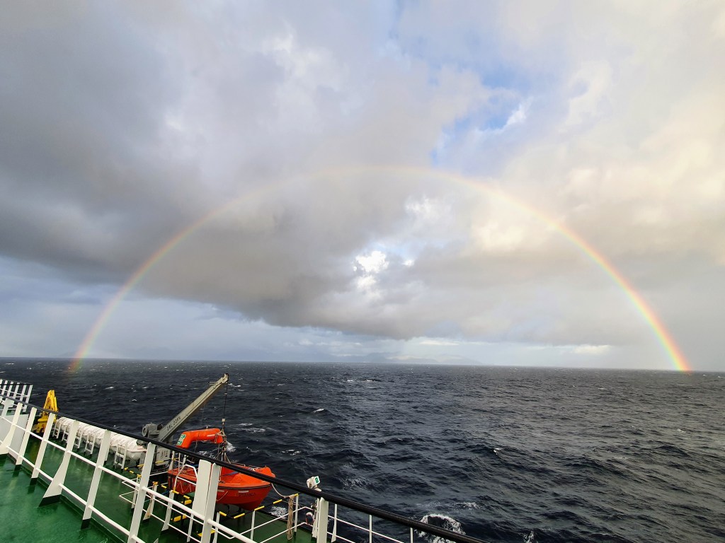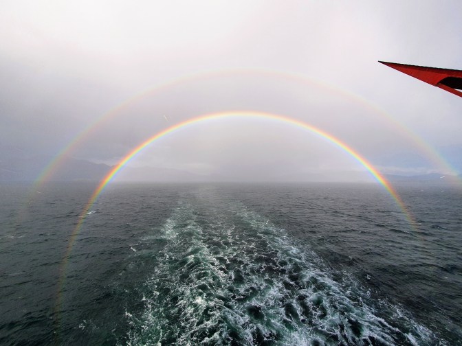 The afternoon was spent eagerly whale watching in the constantly varying weather. Having so much cloud was very disappointing; as it cloaked any of the larger peaks you would normally see on this voyage, including the volcanoes that line the route. One advantage of the constantly interchanging rain and patches of sun, however, was that they formed the most spectacular rainbows I’ve ever seen. The colours were so intense that I know the photos look photoshopped – but I promise you they did look like that!