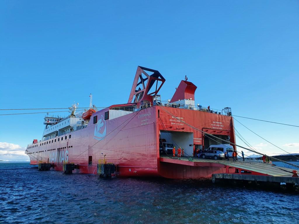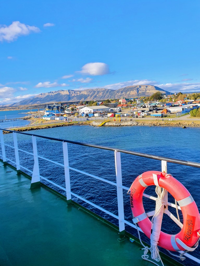 Check-in for the ferry was between 10 and 11 in the morning prior to setting off later in the afternoon. It is important to note that the ferry did not depart from near the office in Puerto Montt, rather it left from a pier 10km along the lake. Our Uber dropped us off at the pier at about 10:45. It was only as the car drove away that we realised that the check-in office was not at the pier but rather a bit further along the road. So we humped our luggage along the main road, up through the large car park and to the marquee that acted as the office. The check-in process was pretty straightforward, you just needed to show your negative PCR or Rapid Antigen test result along with your Chile Mobility Pass (I’m not sure what you would need to check-in now!). They then took you along to the ferry in a van at the appropriate time. We got lucky in that there were hardly any passengers joining but if you are doing the trip now out of COVID and more during peak season, I’d make sure you get there an awful lot earlier than we did.
