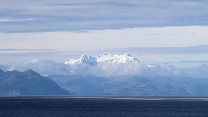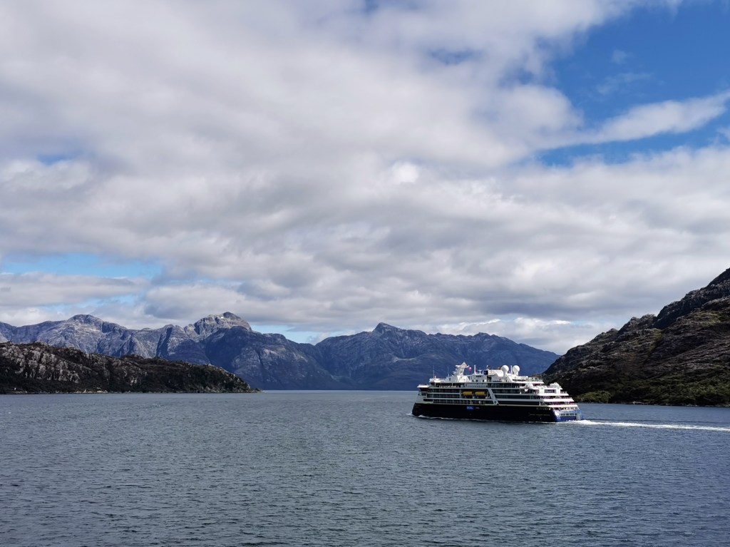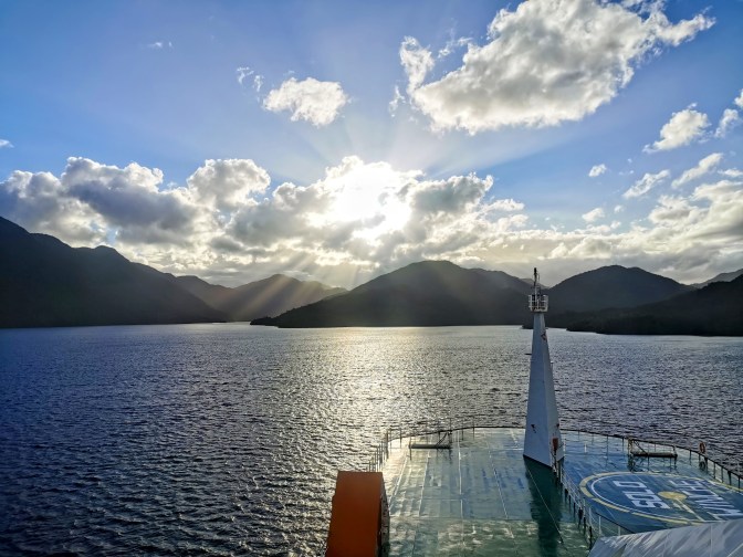After several gloomy days in Puerto Montt, there was finally a little snippet of sunshine so we spent a while sitting at the front of the ship anticipating setting off. We didn’t have to wait as long as I thought and, taken by surprise, I jumped out of my skin when the horn blared three long bursts to signal the start of our journey. It was slow going at first, as we carefully left the area near the town, but the boat soon got into its stride as it set off for the straight between the mainland and Chiloe Island. After another huge meal, we got a brief glimpse of the Sun descending past the clouds before heading to our cabin for the night.