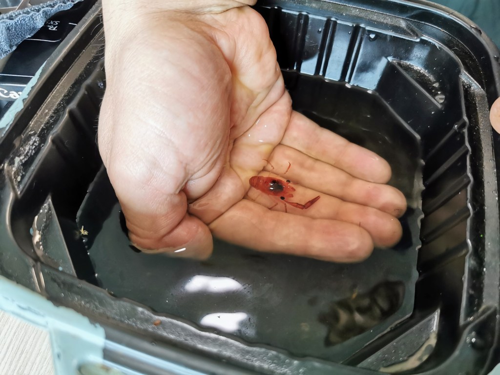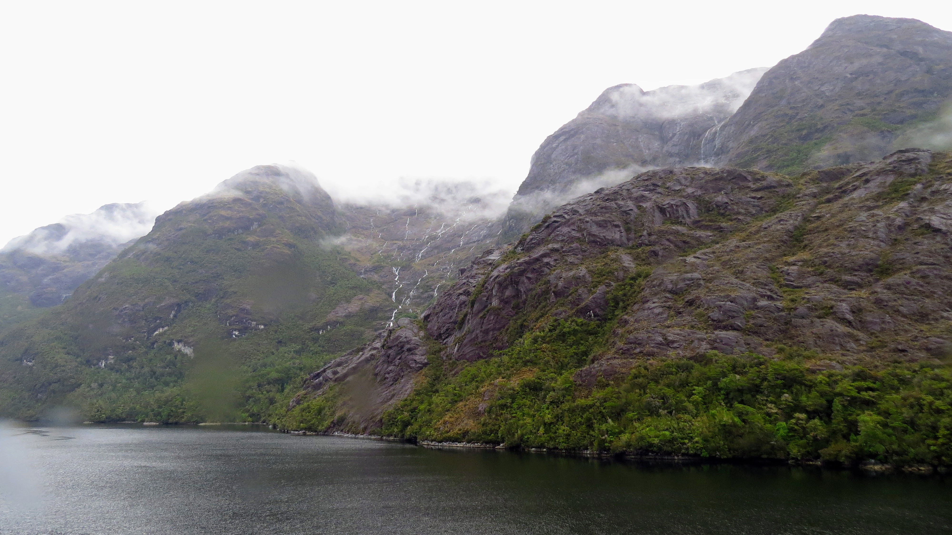 The morning started much the same way as the previous one, except that I could see the cloud and rain from our window rather than having to go outside. By breakfast time the sun had made an appearance but the clouds still lingered for the rest of the day, meaning rain mingled with the mist and occasional patches of blue sky. The morning and beginning of the afternoon was spent working our way through the channels. The views were pretty but would have been better if we could have seen beyond the slopes rising from the water. The low thick cloud still prevented this however. One of the crew rather randomly brought around a couple of trays of water containing krill that had been trapped in the ship and they were much bigger than I’d imagined them to be.