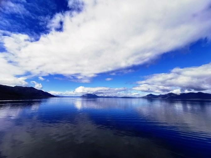By midday the clouds had largely broken up, and the blue sky made such a difference to the surrounding landscape. We were able to see some of the snow-capped peaks and enjoy the glimmering reflections in the water.