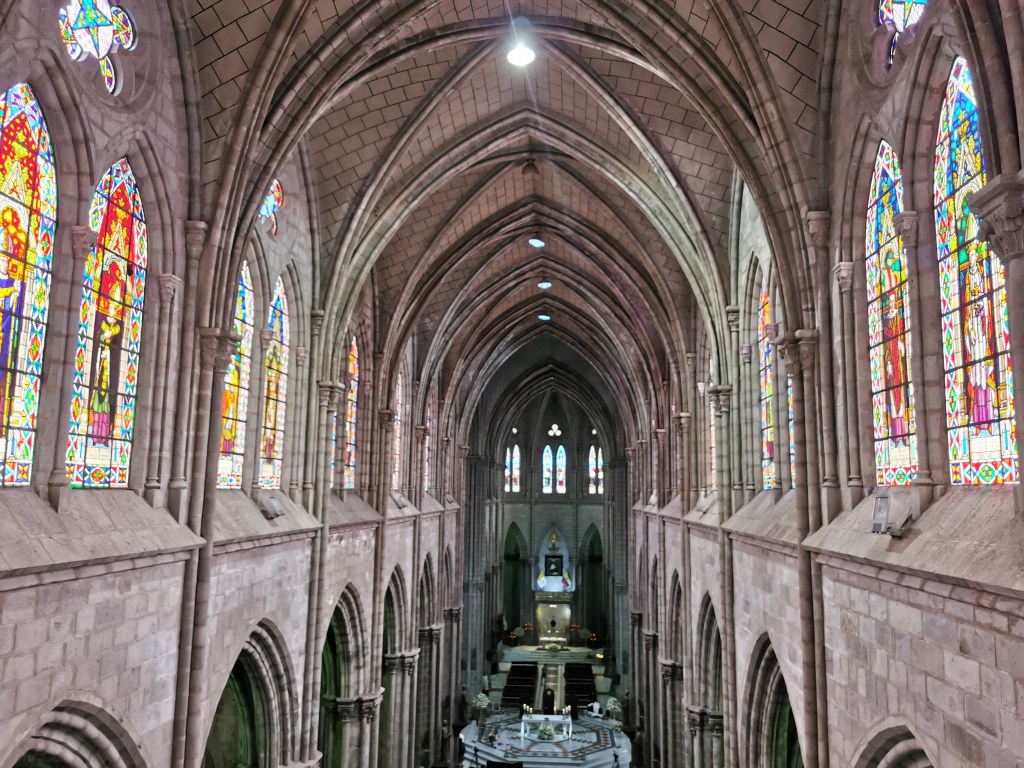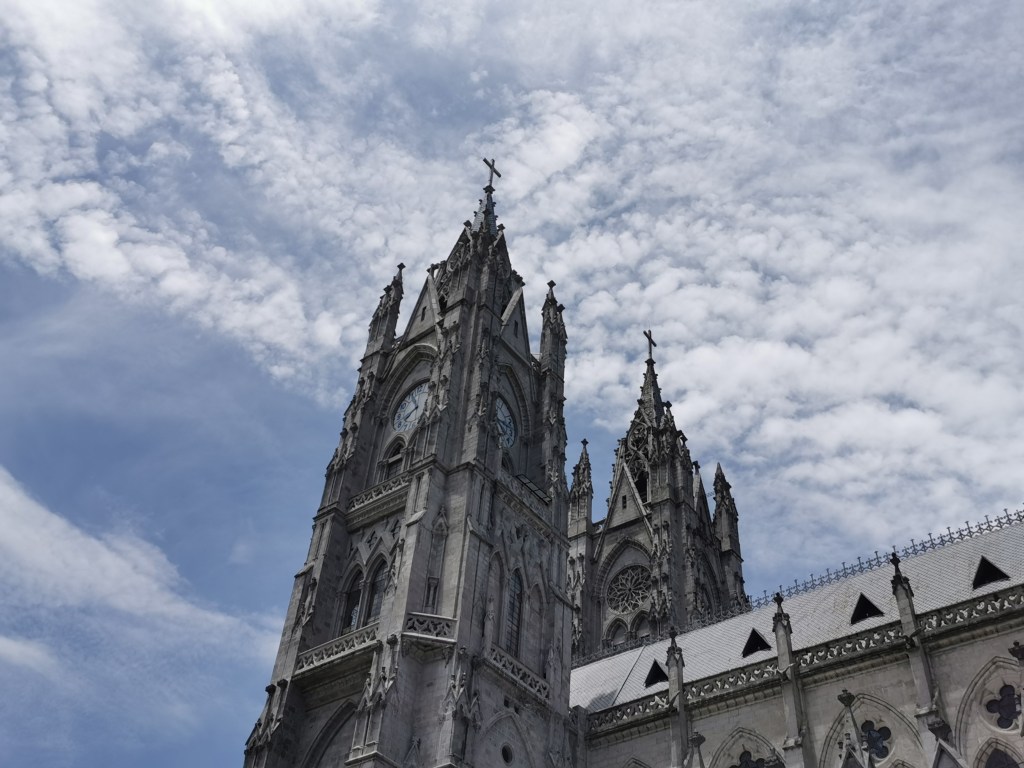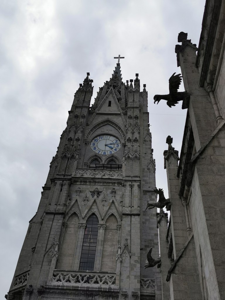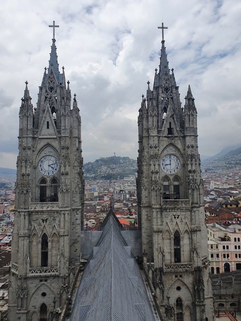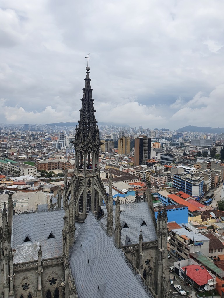Normally going up the tower of a church takes about fifteen minutes and provides you with a nice view around. It is a nice activity but not one that will live long in the memory. Climbing the towers of the Basilica del Voto Nacional was different – it was fun and was probably our favourite activity in Quito itself.
